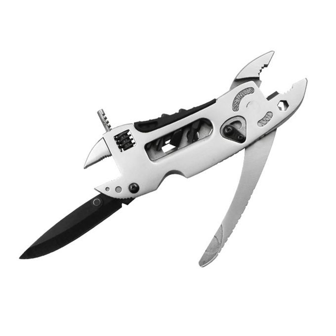 All in One Tools: different tools including wrench, 3x screwdriver bit, clamping pliers, wire , conventional pliers, 2x bit socket holes, etc.