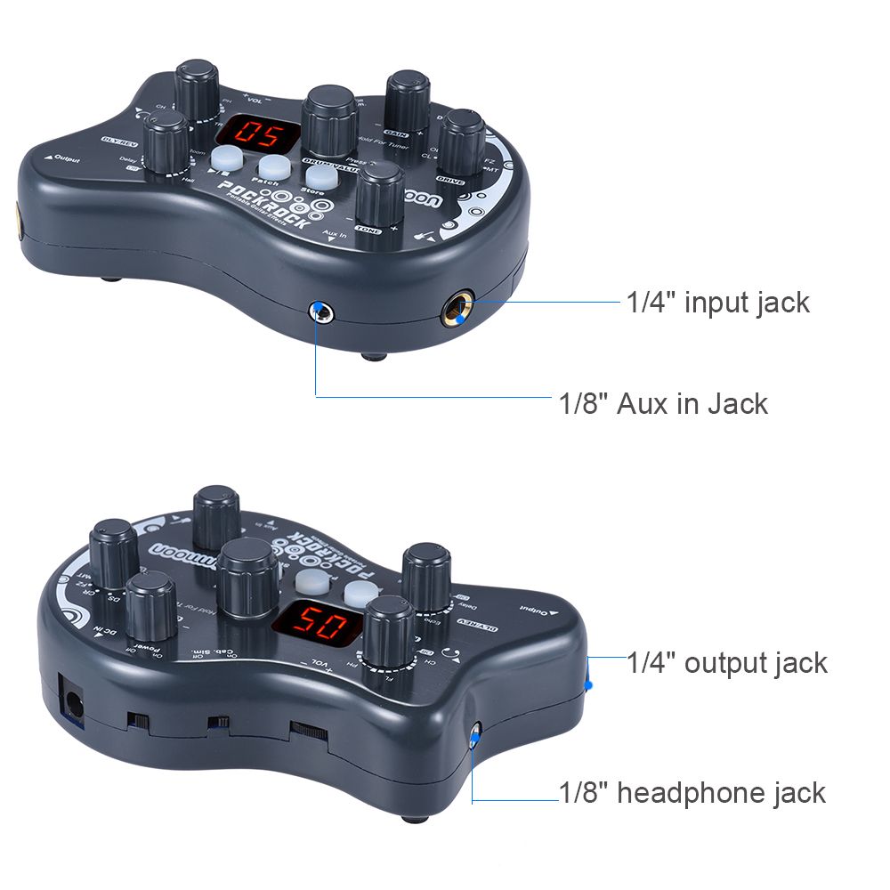 PockRock is a portable guitar multi-effects pedal. 5 effect modules with 15 effect types, 40 drum rhythms, 16 preset patches and 16 user patches. It is not only a sound library, but also allows you to create your own sound library. With headphone out and AUX in, you can enjoy your playing at night and no need to worry about disturbing others. Battery-powered mode allows you to take it to everywhere. Everything you need is in PockRock!
