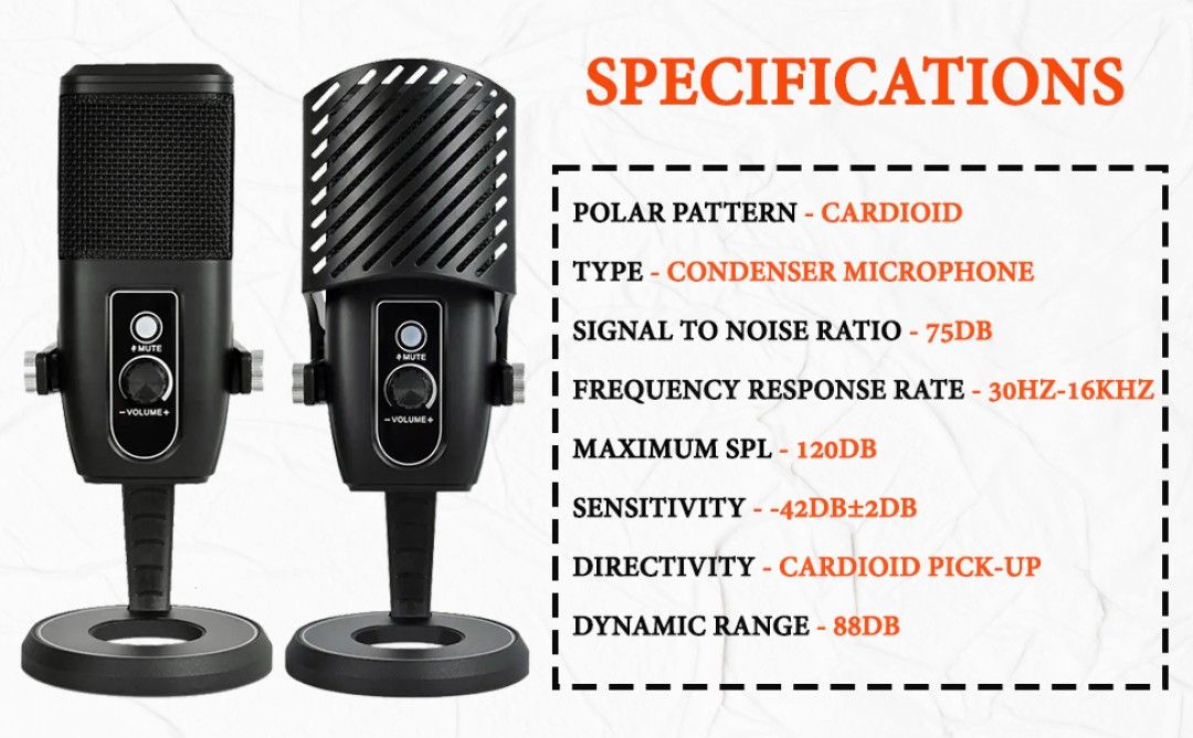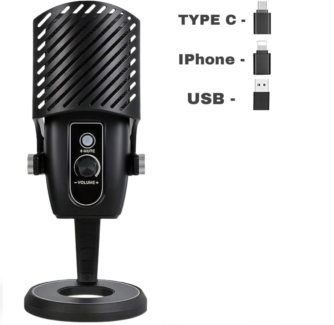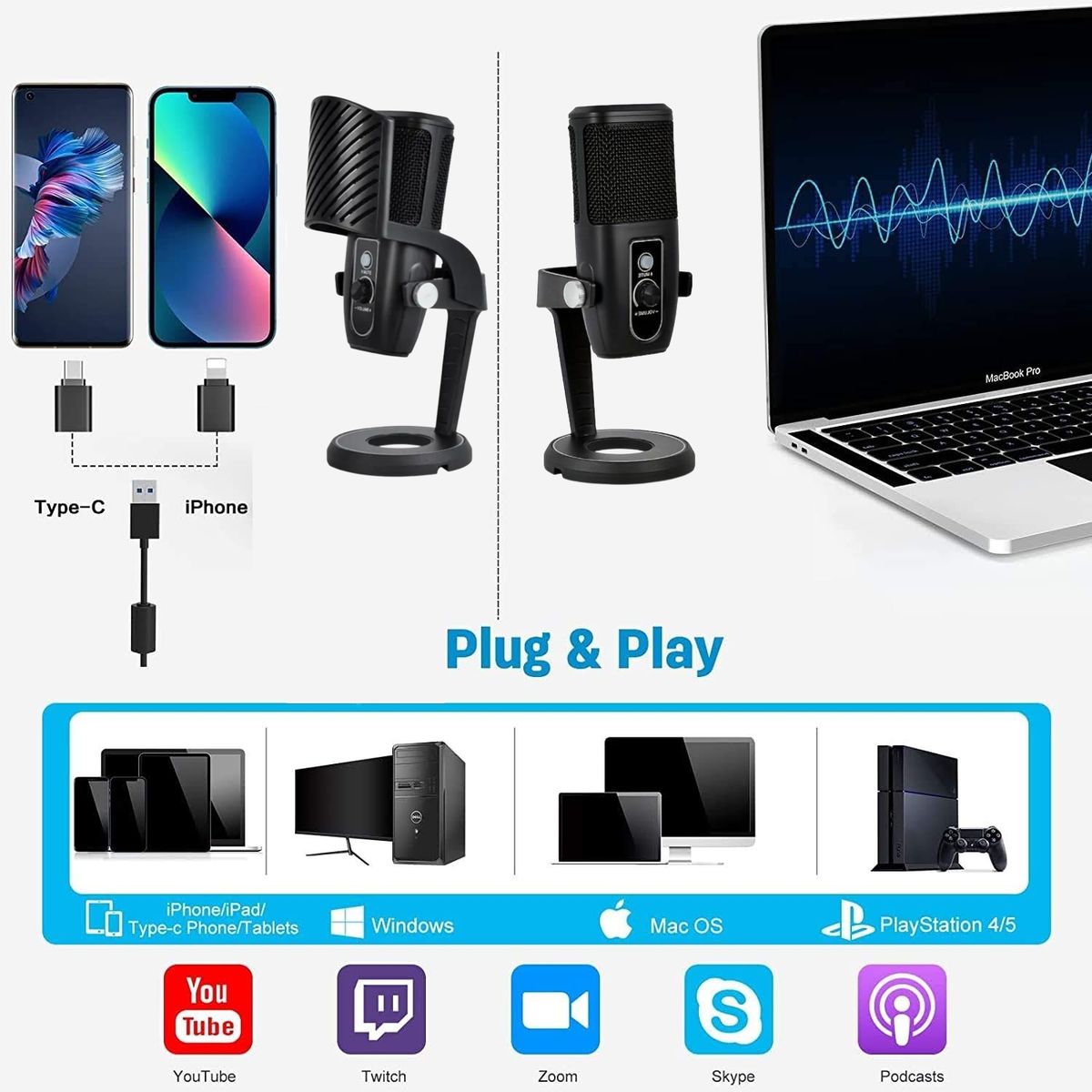 Streamlined Plug&Play Setup】 USB output enables direct integration with a desktop or laptop computer MacBook; PS 4 & PS 5; All Type C devices(Phone, tablets and PC). iPhone Products (USB TO LIGHTNING ADAPTER INCLUDED). No additional driver is required. This condenser microphone is compatible with Windows, macOS, Linux and Android. Ideal for gaming, podcasting, zoom meetings, streaming, Skype chatting, online conference, podcasters, YouTubers, vloggers, gamers and voice-over artists in homes, project studios.【Excellent Sound Quality】Stereo microphone deliver crystal clear, well-balanced reproduction across a wide frequency response and handles high SPLs,provide detailed,quality faithful sound for studio or on-the-road use. Cardioid polar pattern for minimal noise and feedback control,offers pristine and accurate capture.Suitable for presentations, podcasts, zoom, skype, recordings, instant messaging,game and stream on twitch.【Real-Time Monitor】The desk microphone's 3.5mm stereo headphone output provides direct, latency-free monitoring ! It allows you to monitor the microphone input in realtime. Good for home studio, Home Karaoke, Gaming, Singing, Chatting, Smule, Garageband, Skype, Discord, Yahoo Recording, YouTube Recording, Google Voice Search, Zoom meetings, Online Class and Live Stream.【Professional Desktop Microphone】With Mute/Noise Cancel Button and adjustable Volume/Echo knob; the built-in LED light to indicate the working status; the DSP noise cancel chip, all provide a simple efficient and professional system for speech, podcasting, asmr and voice over applications.