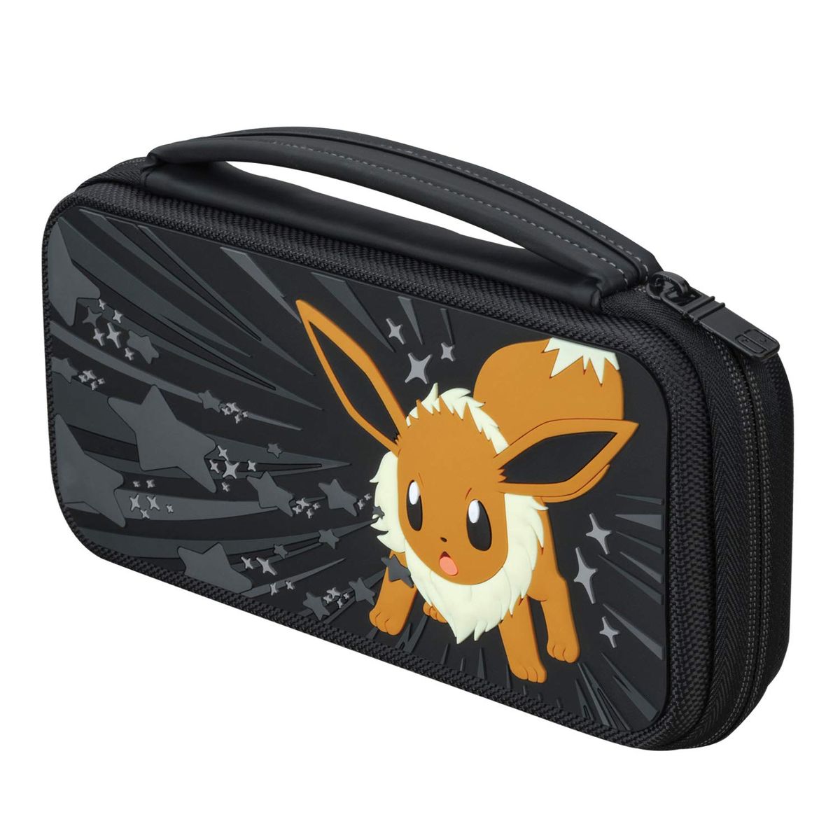 The System Travel Case features a comfort grip handle for easy carrying and dynamic 3D sculpted tonal design of Eevee ready for battle. With room for up to six game cards and a pouch for accessories, this case will serve you well when you want to travel light. Stores Nintendo Switch and features a console lift strap for easy, one-handed removal.