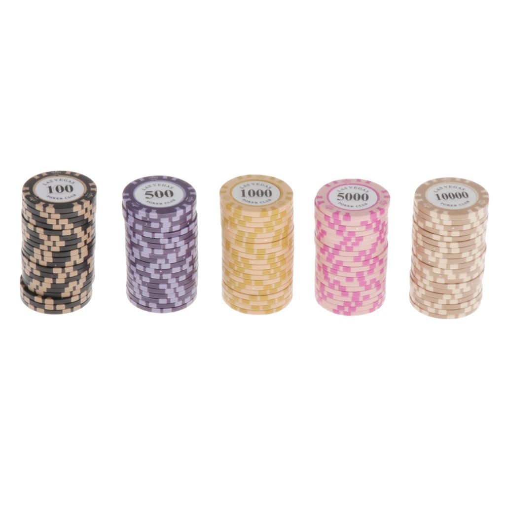 - QUALITY CHIPS - These poker chips use a clever pattern detailing of alternating dice and stripes around the edge. Each is carefully constructed with a composite resin and insert to give the weight and feel of an authentic casino-quality clay poker chip