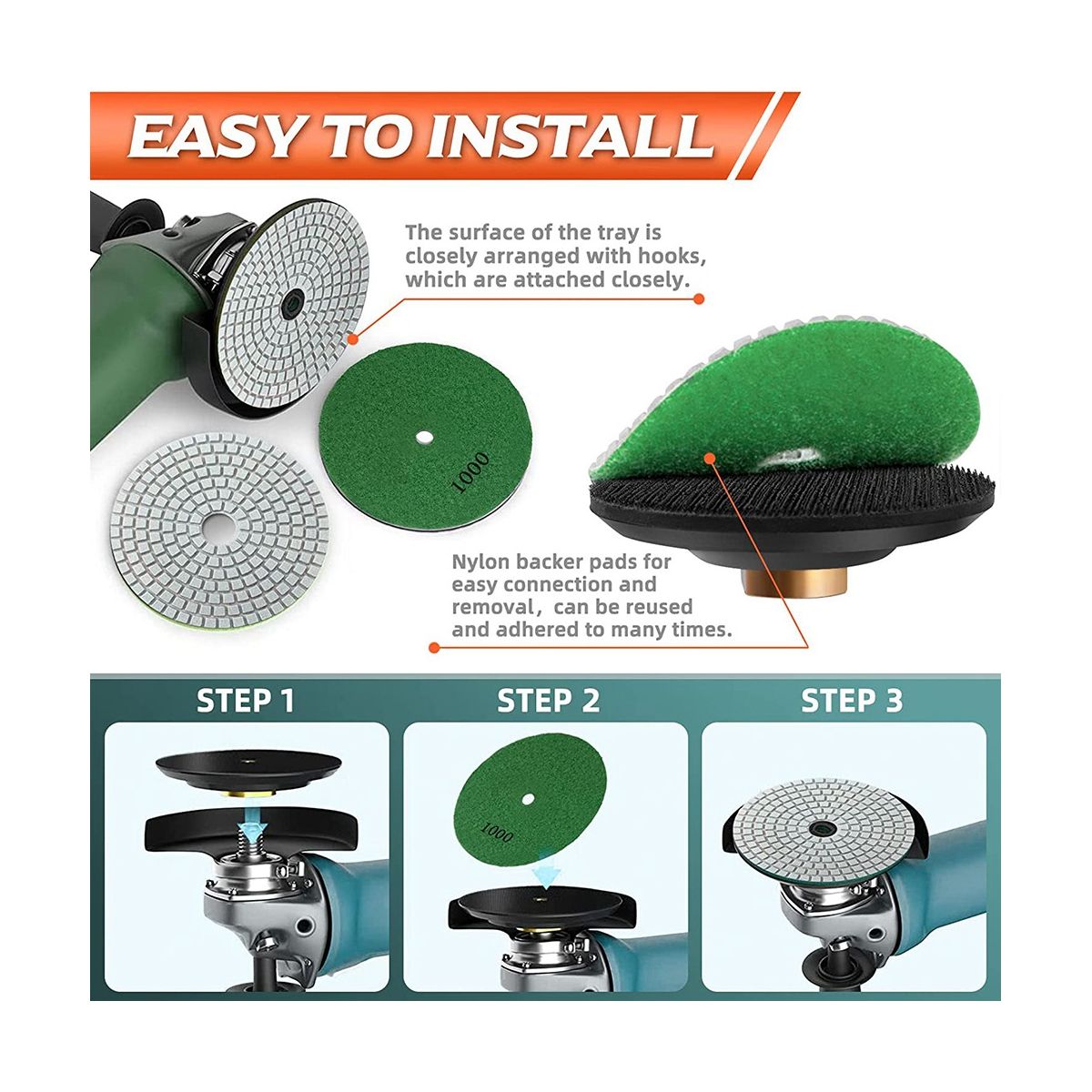 Detailed Information About The Product:[4 Inch Diamond Polishing Pads]: It comes with M10 Backer Pad, 18-Piece Wet/Dry Polish Pad Kit for Drill Grinder Polisher and 30-10000 Grit Polishing Pad for Granite, Marble, Concrete, and Quartz.