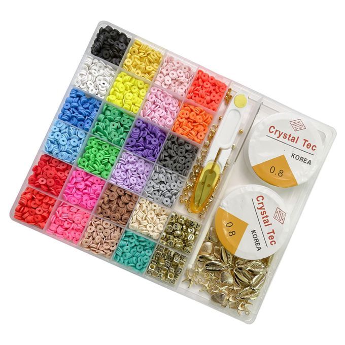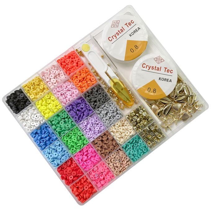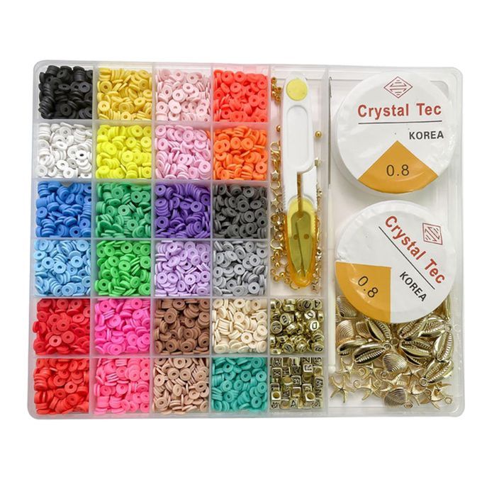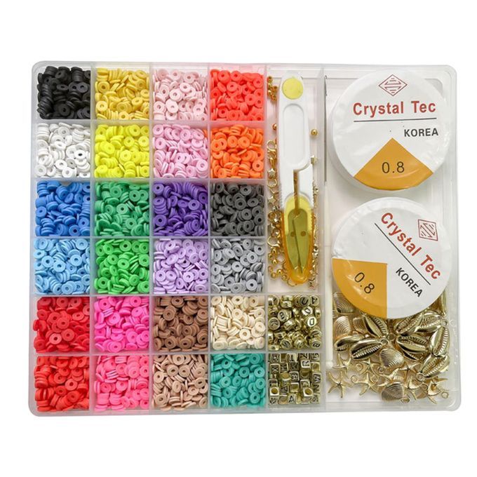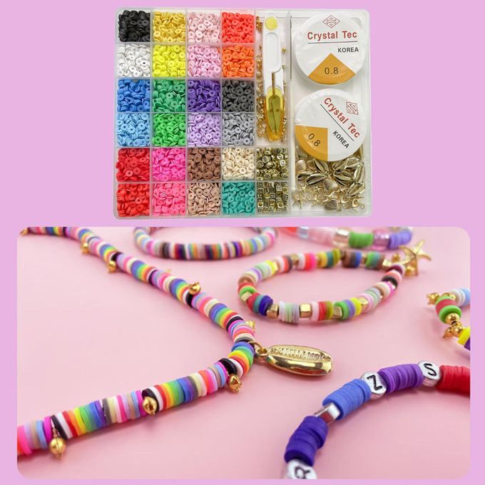 All You Need Included, A box of Flat Round Polymer Clay Spacer Beads kit (contains shells, charms, letter beads, lobster clasp,etc.) to meet all your needs for jewelry making.