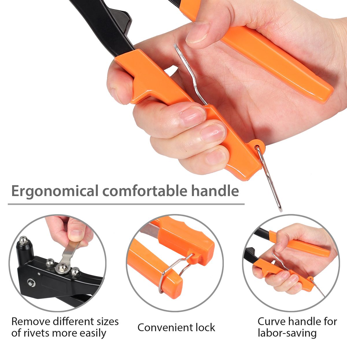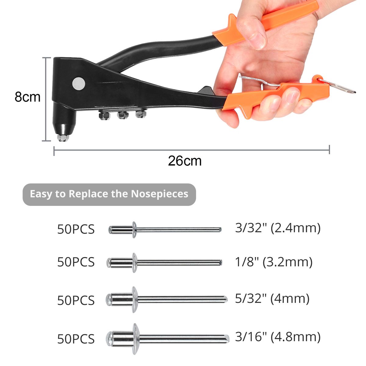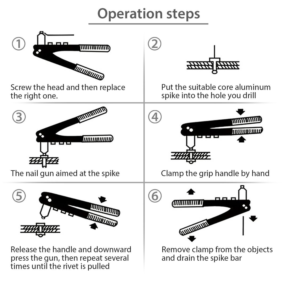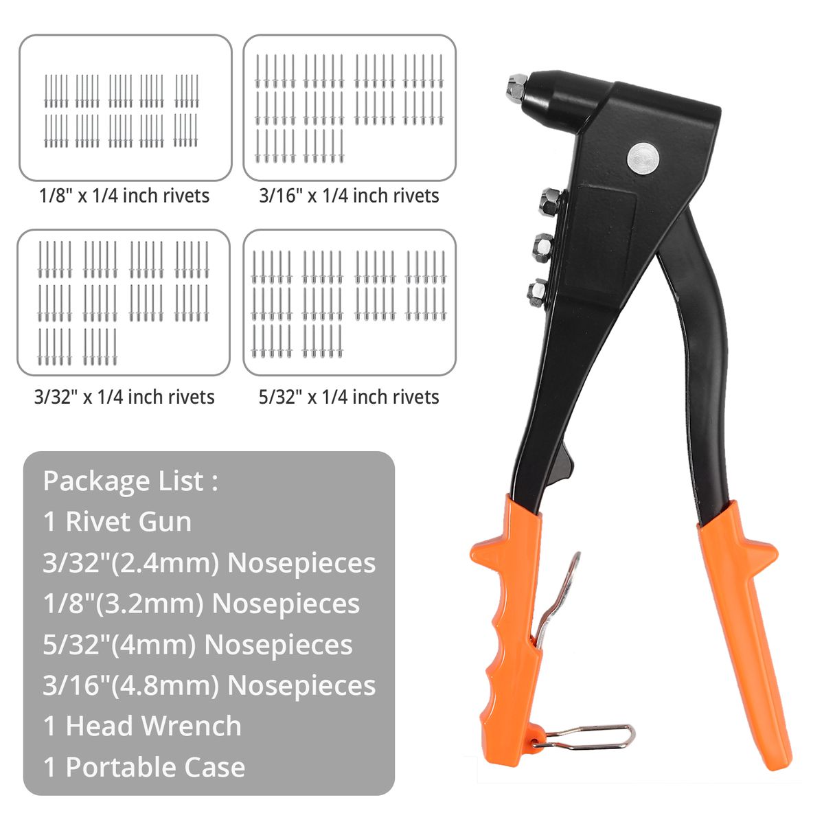[Wide Application] The pop rivet gun is used as riveting fastening tool for all kinds of mental plate and in industrial manufacturing. Recently, pop rivet gun is widely used for automotive vehicle, aviation, railway, elevator, instrument, furniture and so on. Pop riveting is a technique that is used to join or rivet thin pieces or sheets of metal or plastic. It is ideal for all kinds of DIY projects. Pop Rivet Gun has 4 different sizes, which can greatly meet your requirement.[Much Sturdier] Our riveter has a high strength aluminum body with drop forged carbon steel upper handle. The component of riveter gun adopts heat treated that makes the gun much sturdier and more durable. The fulcrum pin is made of cold-formed, heat treated steel to prolong the using life of rivet gun. Spring-loaded handle ejects rivet stem automatically. Whether you're a novice or seasoned riveter, this gun will accomplish your needs.[Labor-saving]The rivet gun adopts ergonomics design to greatly save your strength. Powerful and do not require much strength to make a perfect riveting. The thick PVC grips provide comfort for the user. Anti-slip handle makes work easier and improve user's work efficiency. Saving your time make you to do more things. The unique design of rivet gun allows for use with one hand.[Easy to Squeeze] The Pop Rivet Gun kit has a small wrench that is handy for removing the adapter for the rivets of different size. This riveter will reliably grip your mandrel and make sure it seats correctly. Ar 2-3 tries, the pop rivet gun would snap off the rivet pin. This riveter comes with four mounted nose pieces 3/32", 1/8", 5/32", and 3/16". Ar rivet finally was finished, you wilet the remaining pin out of the gun easily.[Convenient Storage] In the bottom of pop rivet gun, there is a stainle buckle. When you don't use it, you can buckle the safe lock. The pop rivet gun will become small to save your space. And it will also become portable, which is convenient for your work and life. Portable box ensures you to take it to any place that you want to go.Package List:1 PC rivet gun with 4 different sizes heads1 PC Head wrench1 PC Portable case50 PCS 3/32 inch x 1/4 inch rivets50 PCS 1/8 inch x 1/4 inch rivets50PCS 5/32 inch x 1/4 inch rivets50 PCS 3/16 inch x 1/4 inch rivetsHow to use Pop Rivet Gun?①Attach a correct size drill bit to drill.②Place one of the objects to be joined on top of the other object where you want them to be joined.③Clamp the objects firmly together.④Drill a hole through both objects.⑤Insert the long end of a pop rivet into the pop rivet gun.⑥Push the short, wide end of the rivet through the holes in both objects.⑦Squeeze the trier of the pop rivet gun a few times until you hear and feel a pop. The gun has popped the mandril end off of the pop rivet and the two objects are locked together.⑧Remove clamp from the objects.Precautions When Using Rivet Gun:●Do not pre the trier of the rivet gun without working.●Do not overload the pop rivet gun.●Do not use the working pop rivet gun pointing at thelves or others.●Always use the correct rivets; otherwise, the rivets will be stuck in rivet gun.●Always wear safety glaes when operating the rivet gun.●When operating pop rivet gun, ensure the tight connection of adapter.●The rivet gun should be lightly oiled every day before use