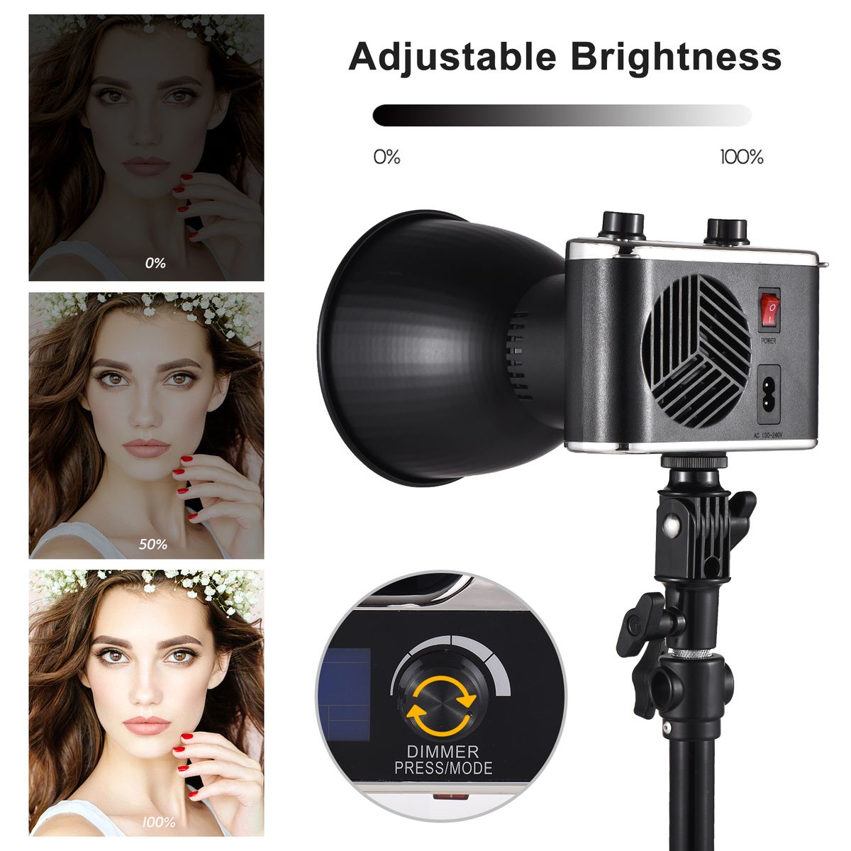 【Portable COB Video Light】Adopts high-quality COB lamp beads, 100W high output and stable illumination, max. brightness is up to 11000LM, and supports strobe mode in low/ medium/ high speed.