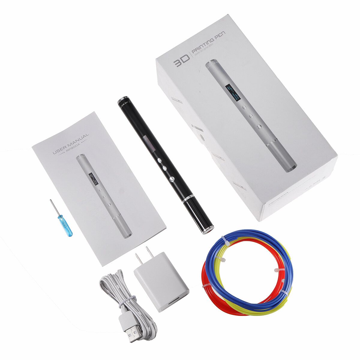 1 x 3D Printing Pen 3 x 3 Meters Cable(Blue/Yellow/Red) 1 x USB Cable 1 x Adapter 1 x Screwdriver 1 x English Manual