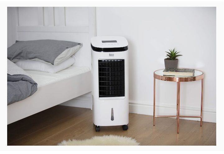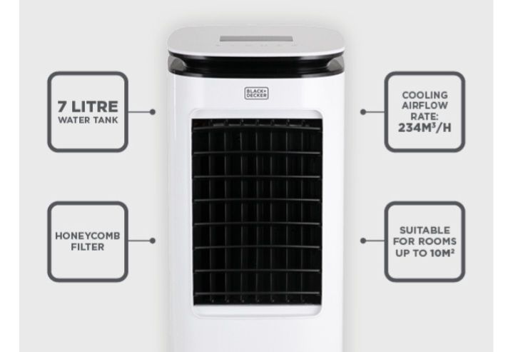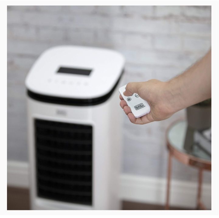 Black+Decker 2-in-1 Remote Controlled Air Cooler with 7 Liter Tank and LED Display can be choosen between high, medium or low airflow settings and adjust the louver to redirect air across a 90-degree angle. The soft touch LED controls are easy to use, with remote control operation that allows you to set the 7.5 hour timer for flexible cooling. The advanced cooling system uses dual ice packs to improve the cooling performance by evaporating water through the honey comb filtration system.