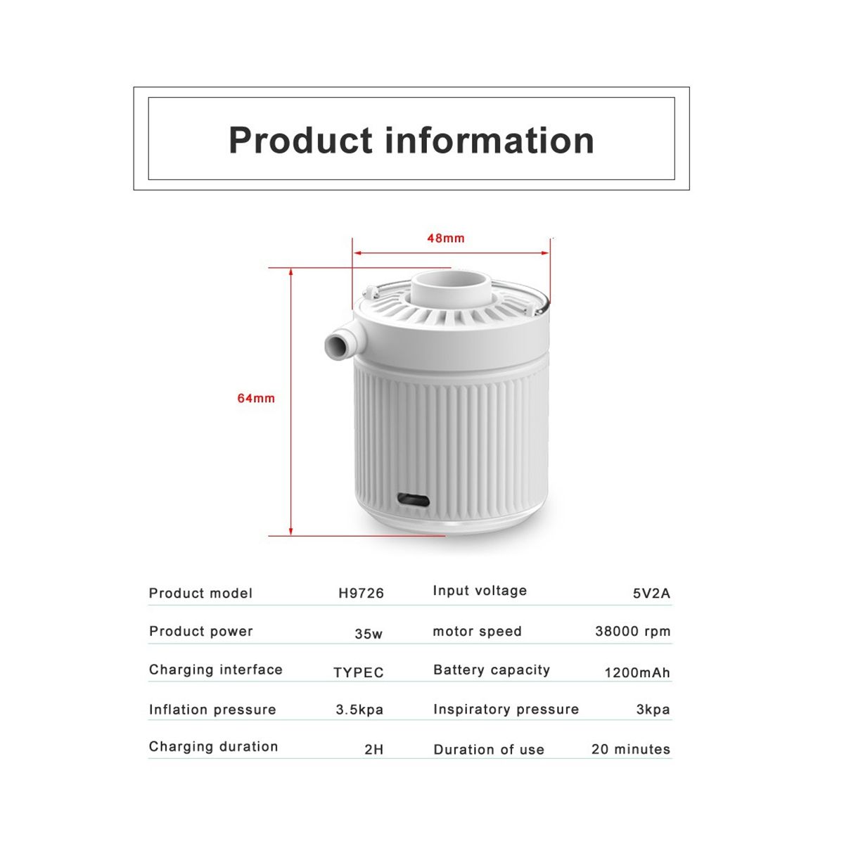 [Durable Power Supply and USB Charging] The air pump has a built-in 1200mAh capacity battery, which can work up to 20 minutes on a single charge. Comes with a USB charging cable, which can be by outdoor power , laptops, and car USB ports, bringing greater convenience to your travels. Colour:White