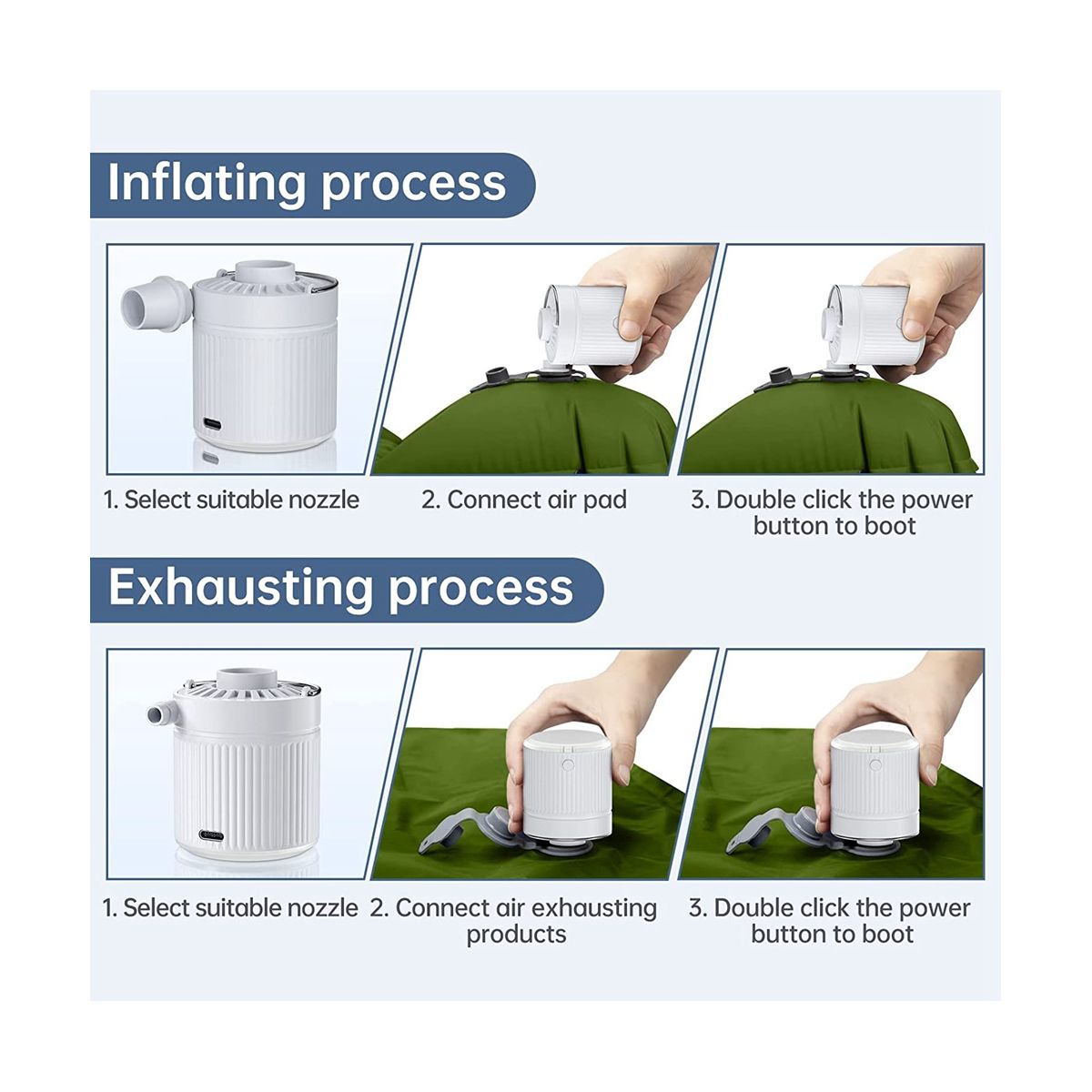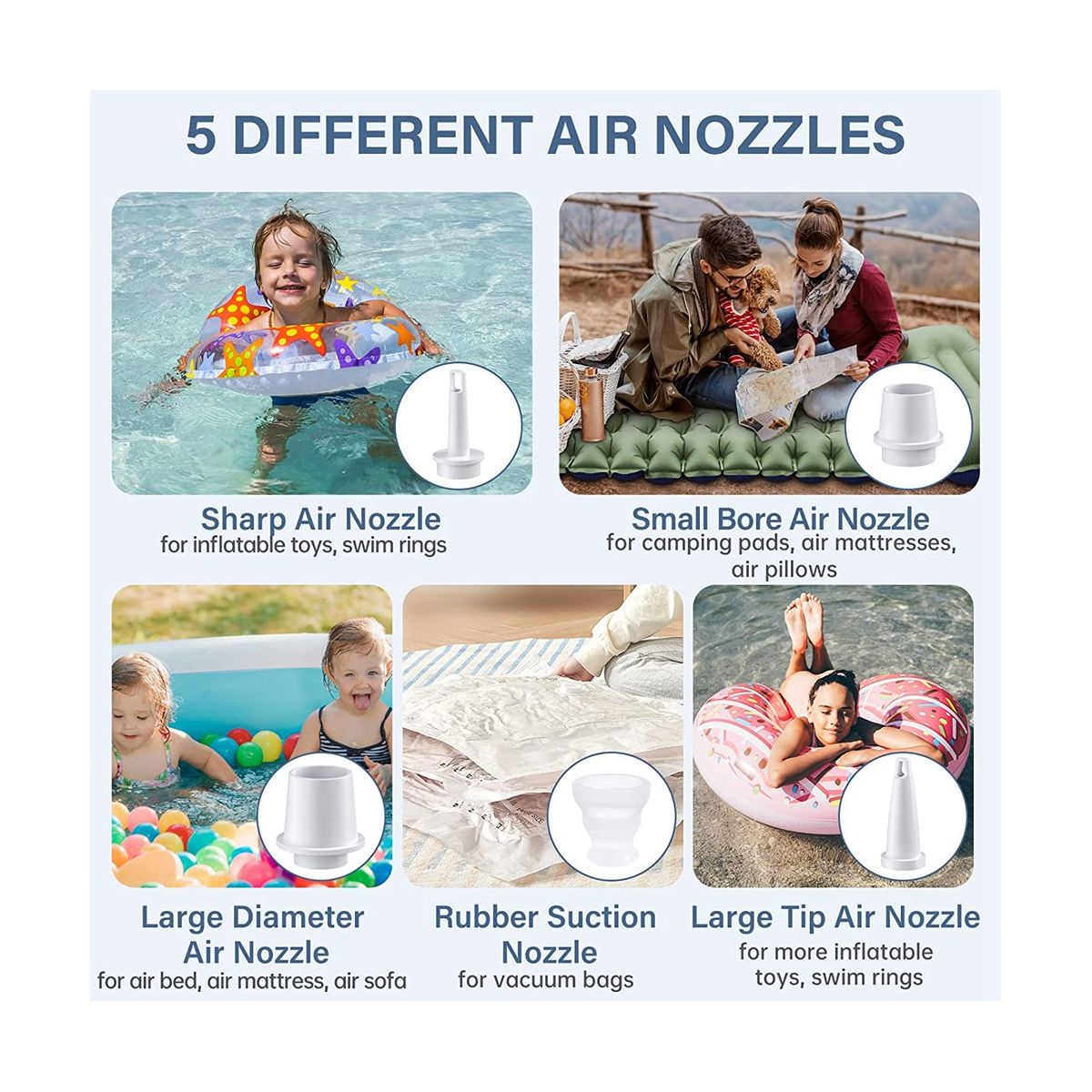 [Different Nozzles] The electric air pump is equipped with different types of nozzles, great for inflatable products, such as air mattresses, inflatable beds, pool floats, sleeping pads, swim rings, inflatable sofa, pool inflatables and other inflatable toys.