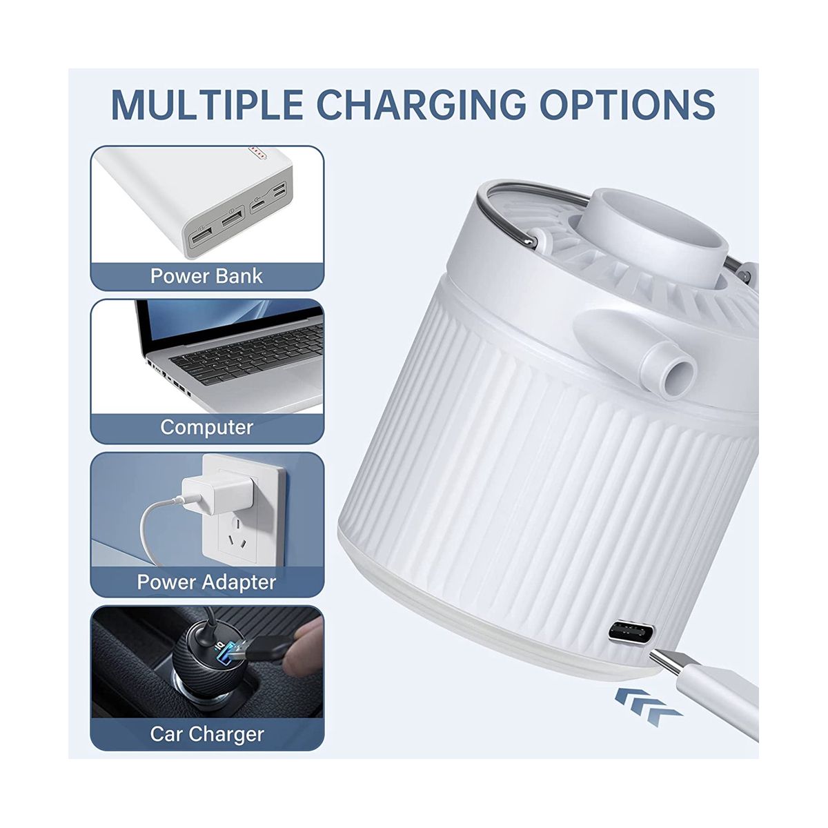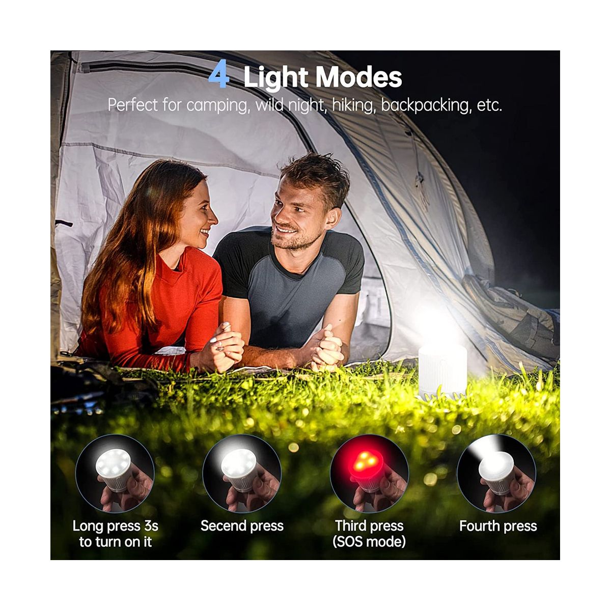 [Practical Camping Light] This USB air pump has 4 different light modes. Long press 3s to turn on the white lights. Press a second time to highlight. In the third press, the red light flashes SOS mode (frequency: 1s on and off per time). Press it a fourth time, and the white light in the middle turns on. Perfect for camping, hiking, backpacking, and traveling.