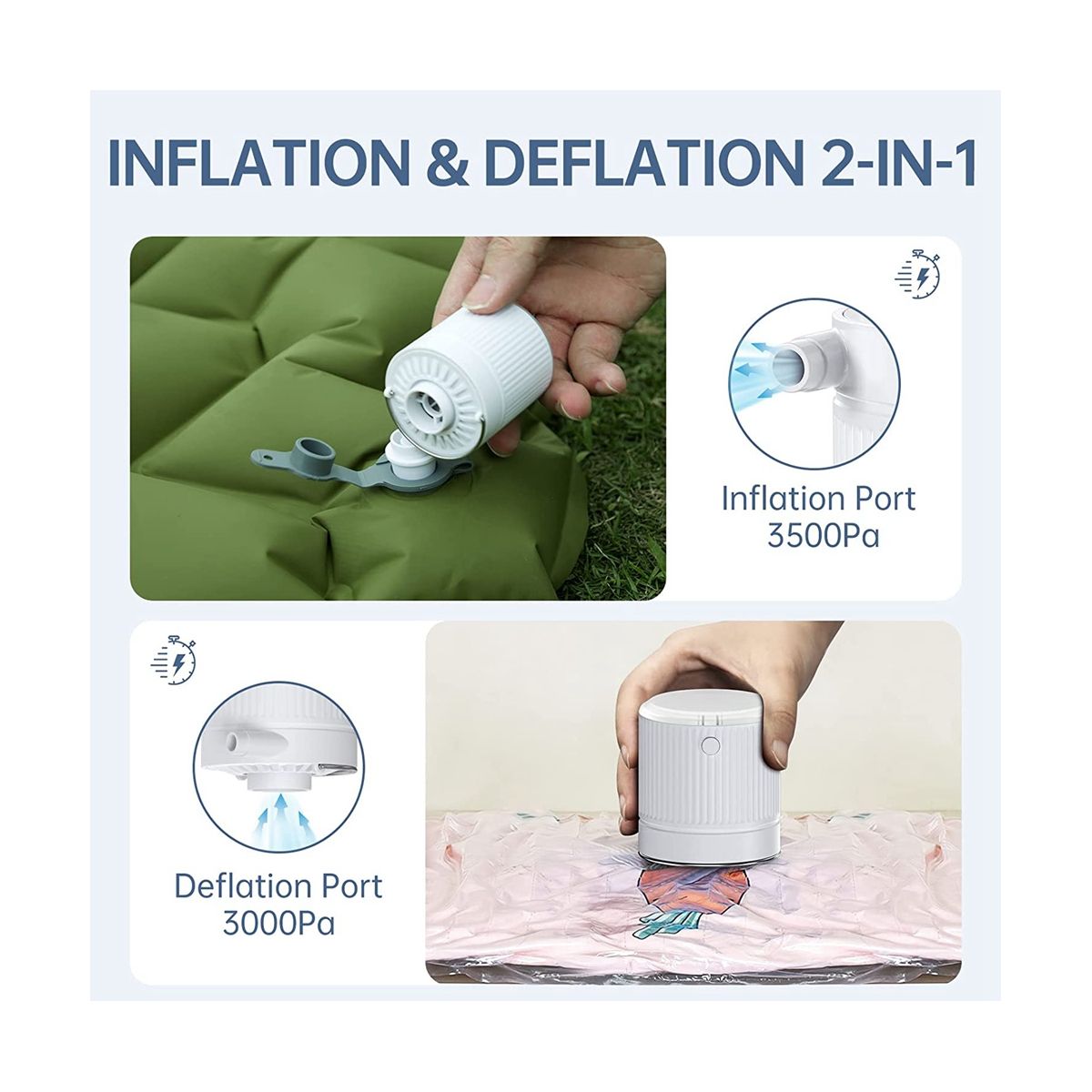 [Quicker Inflation and Deflation] 35W power and 180L/min wind speed make the electric air pump quickly inflate or deflate (inflation pressure: 3500 Pa, deflation pressure: 3000pa). Greatly improves inflation efficiency, reduces time, and makes it easier to enjoy entertainment.