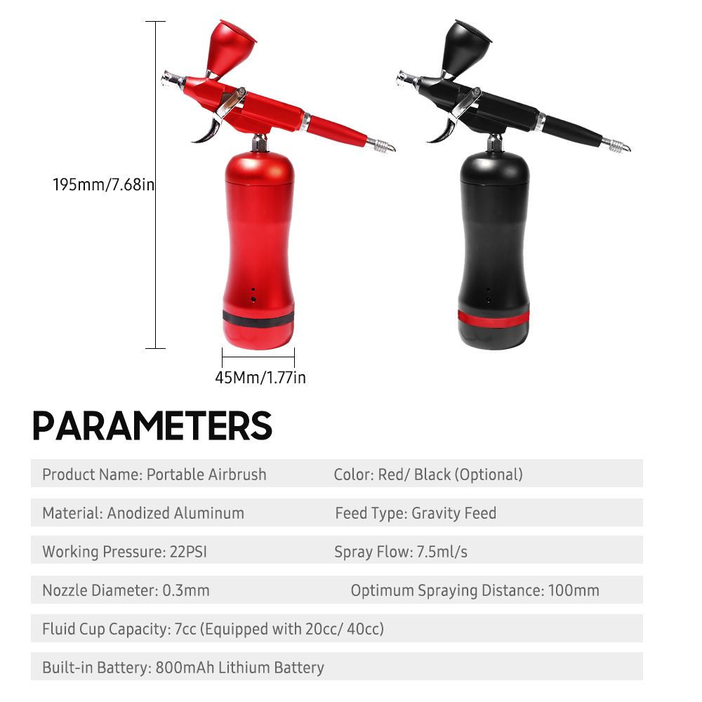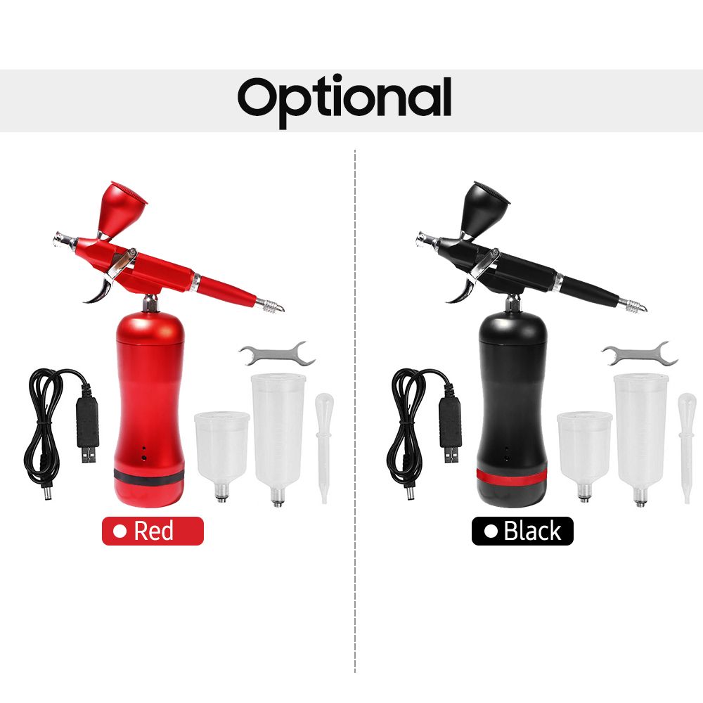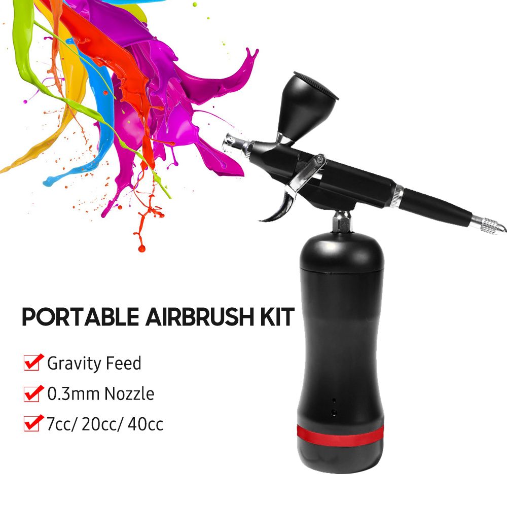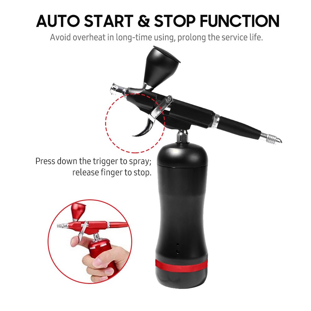 This professional airbrush kit is suitable for fine art, nail art, illustrations, photo retouching, cake decorating, temporary tattoo, make-up, hobbies, etc. With auto start and stop function, it\'s more convenient to use. Compact and lightweight, rechargeable and cordless, it can be widely used both indoors and outdoors.