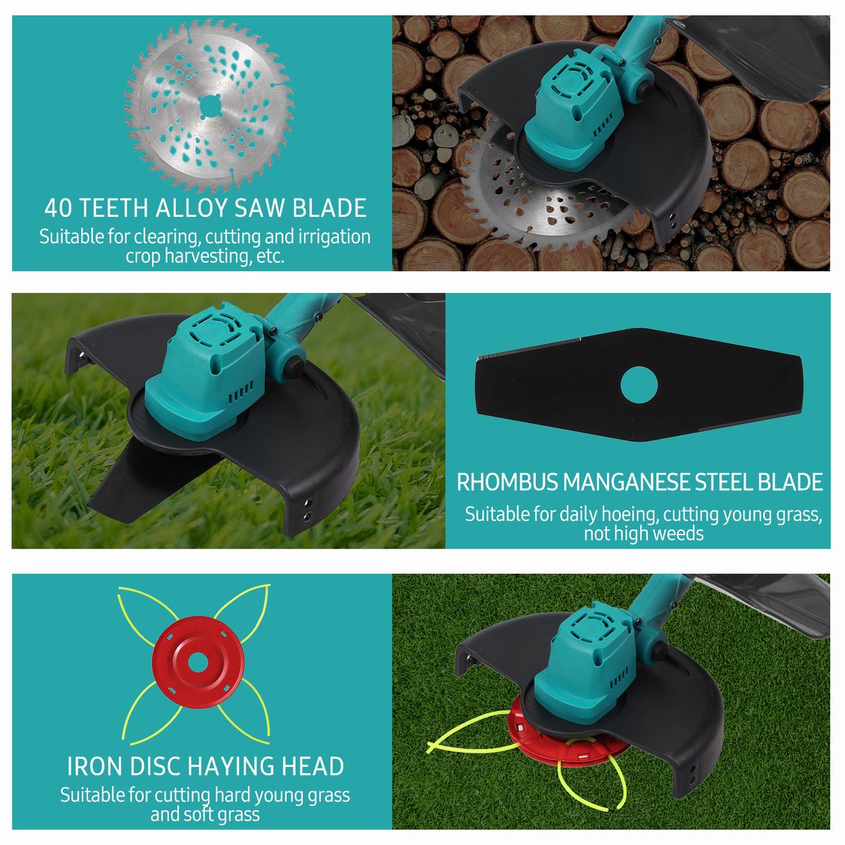 【Three Working Modes】40 teeth alloy saw blade: suitable for clearing, cutting and irrigation crop harvesting, etc; Rhombus manganese steel blade: suitable for daily hoeing, cutting young grass, not high weeds; Iron disc haying head: suitable for cutting hard young grass and soft grass.
