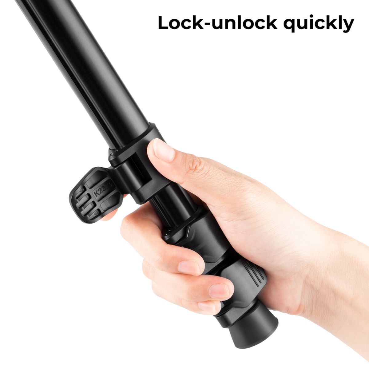 【Portable Tripod for Travel Use】Made of aluminum alloy material, with 1.26kg/2.78lbs net weight and 45cm/17.7in folded length, this camera tripod is easy to carry for outdoor photography. And comes with a storage bag for more convenient carrying.