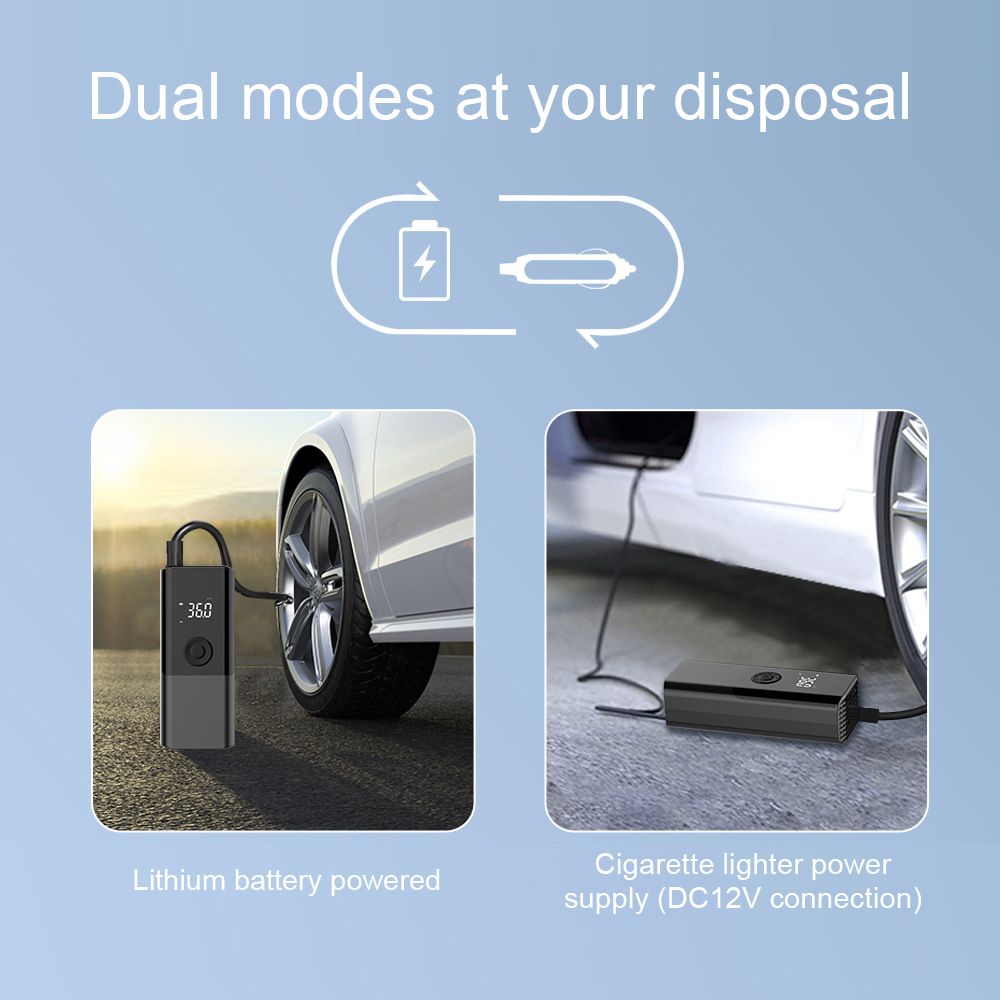 Portable electric inflator pump supports multiple inflation modes, can inflate car/motorcycle/bicycle tires and balls, safety and reliable, high efficiency. Support preset tire pressure, it will stop automatically when it reaches the set value for preventing over-inflation. Compact size and light weight, easy to carry.