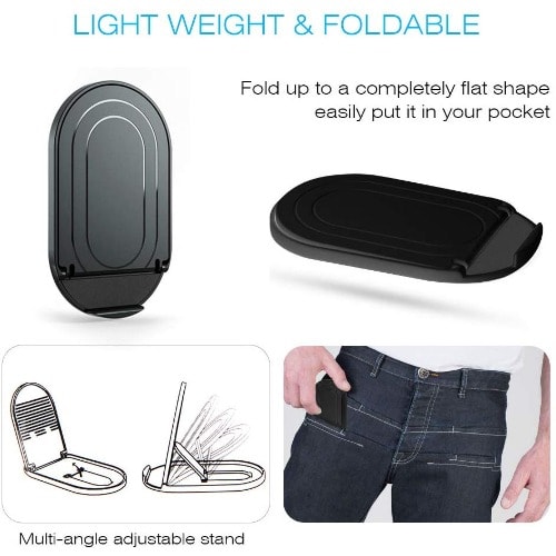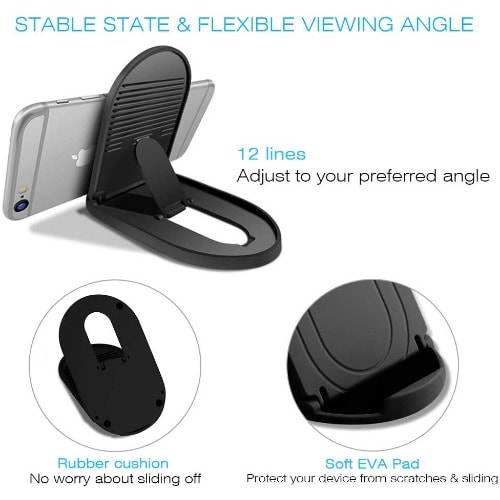 Simple Adjustable & Foldable Design: The Mobile Phone Stand Holder can be fully folded, it & rsquo;s closed flat, which is easy to carry with you while traveling. The Mutiple-angle and height adjustable,which makes for every easy to reading and watching with hands-free.Multi-Angle & Height Adjustable: The desk phone holder can be simply adjusted and choose your preferred viewing angles from 0 & deg;-80 & deg;. The viewing height also can be adjusted with the support bar, holds your cell phone in whatever position , great for hands free reading, viewing or taking table top selfie videos and many other activities.Super Sturdy and Fully Protective Silicone Pad: The adjustable phone holder stand with exquisite aluminum alloy body, can hold your phone steadily. Fully covered top silicone pads and metal weighted anti-slip base well protect your devices from scratches and sliding. The rubber padding on the bottom of the stand allows you to tap on the phone without it sliding around.Universal Compatibility: The folding table holder compatible with 4-9.7 inches devices, like iPhone X XS Max,Samsung Galaxy S10 S9 S8 Plus, Samsung Note 9 Galaxy S9/S 8/S7/S6/Note6, LG, Sony, Google Nexus, iPad mini/pro/Air/Air. Note, if your device with a case, please make sure the thickness of your device is no more than 0.8inCute but stylish and Elegant: Pocket size, easy to carry everywhere. Ideal for your multiple demand of viewing to enjoy your movies, cooking, reading, watching. It is a great desk accessories for your office and home and also great gift for your family friends.