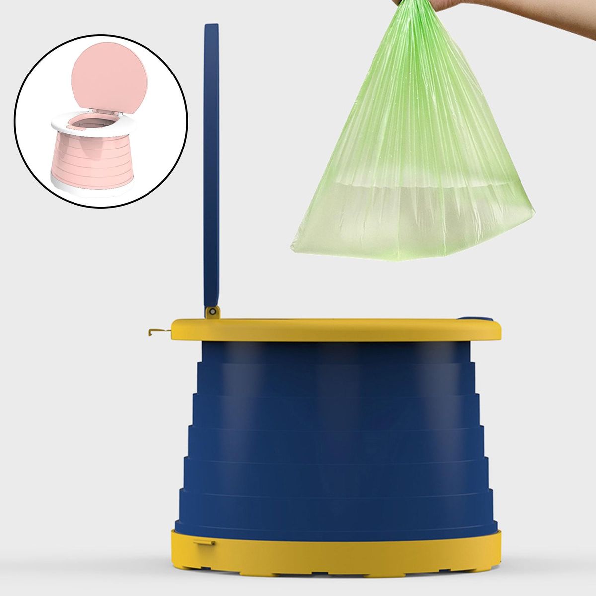 Folding bedpan chair for use. This portable bedpan is equipped with bag, which can be used anywhere, and helps your child deal with toilet emergencies when traveling.