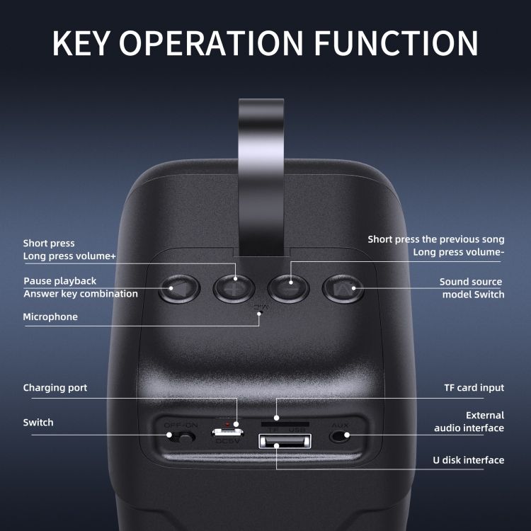 Support BT connection playback, and four playback modes including TF card playback, USB, and AUX-IN.