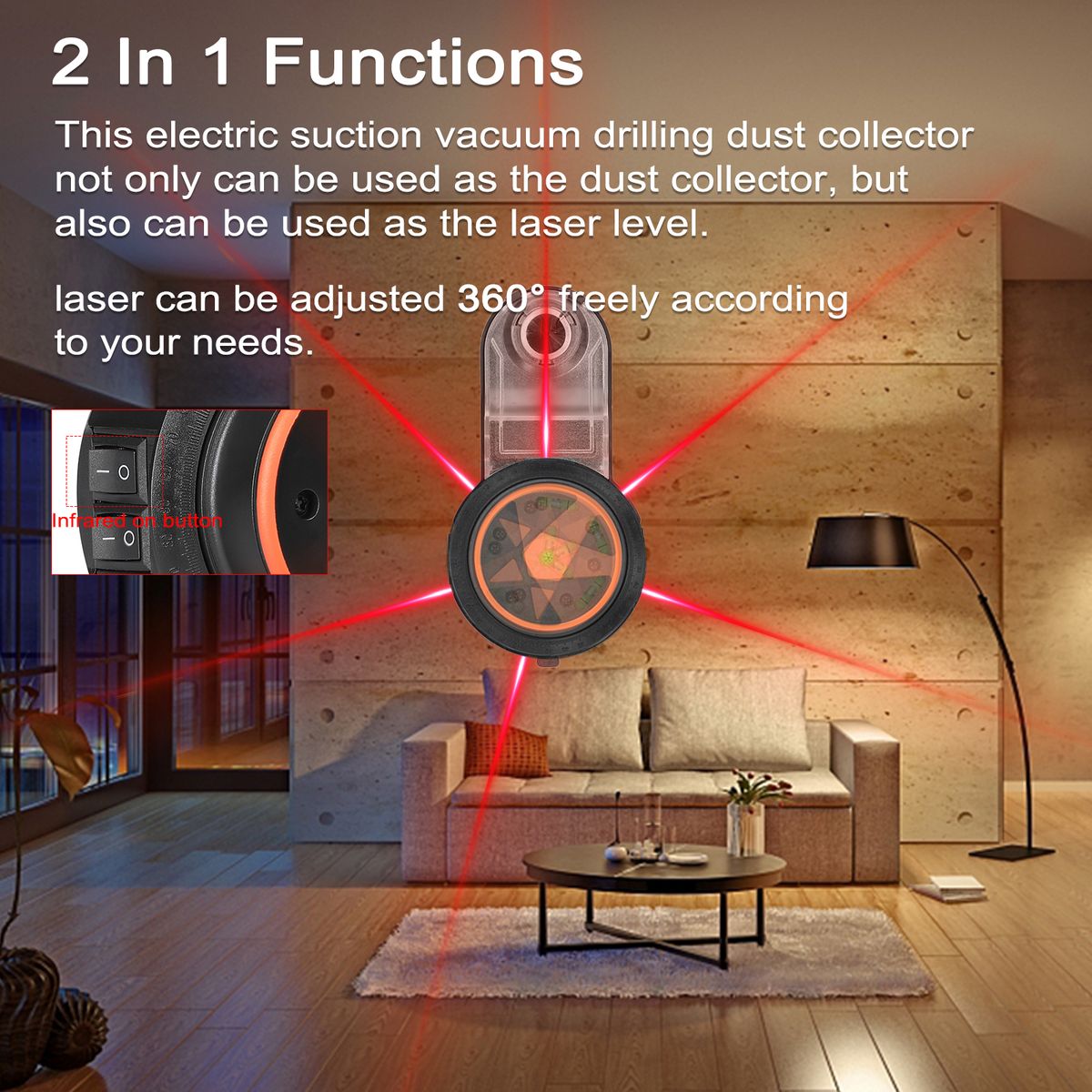 2 In 1 Functions: This electric suction vacuum drilling dust collector not only can be used as the dust collector, but also can be used as the laser level.