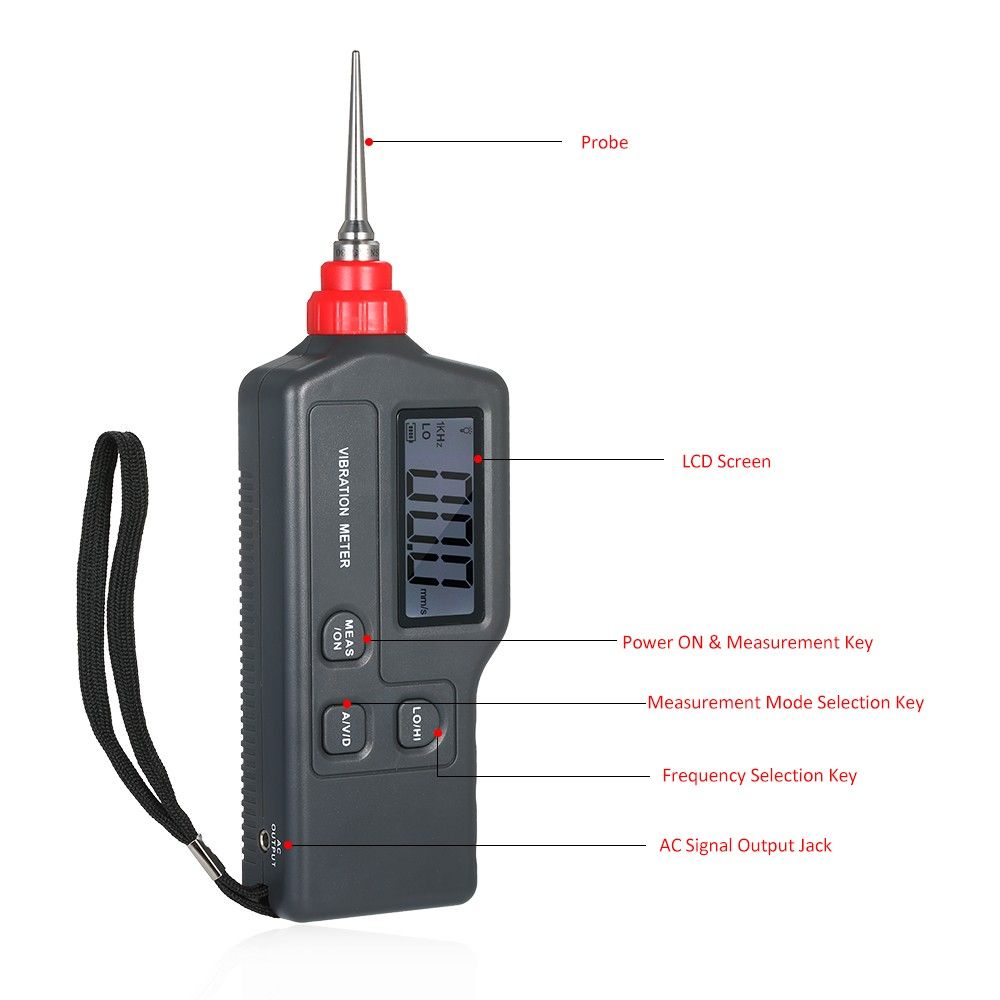 Measurement range: acceleration: 0.1~199.9m/s sup2; peak; velocity: 0.1~199.9mm/s rms; displacement: 0.001~1.999mm p-p.