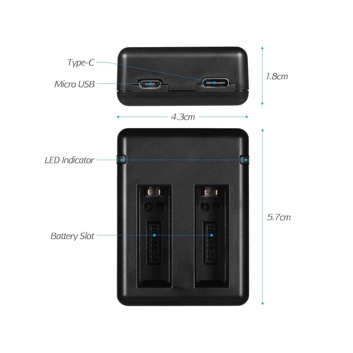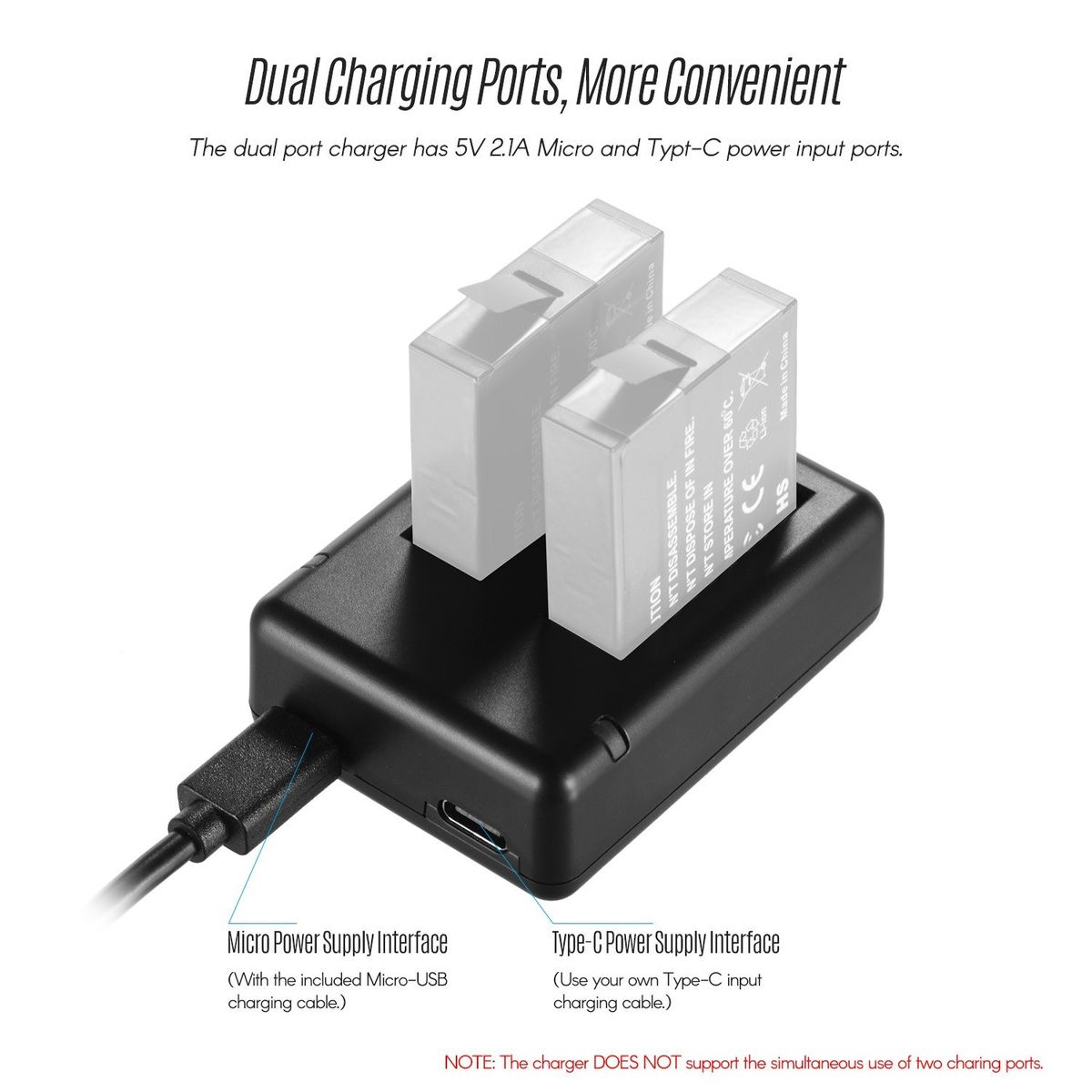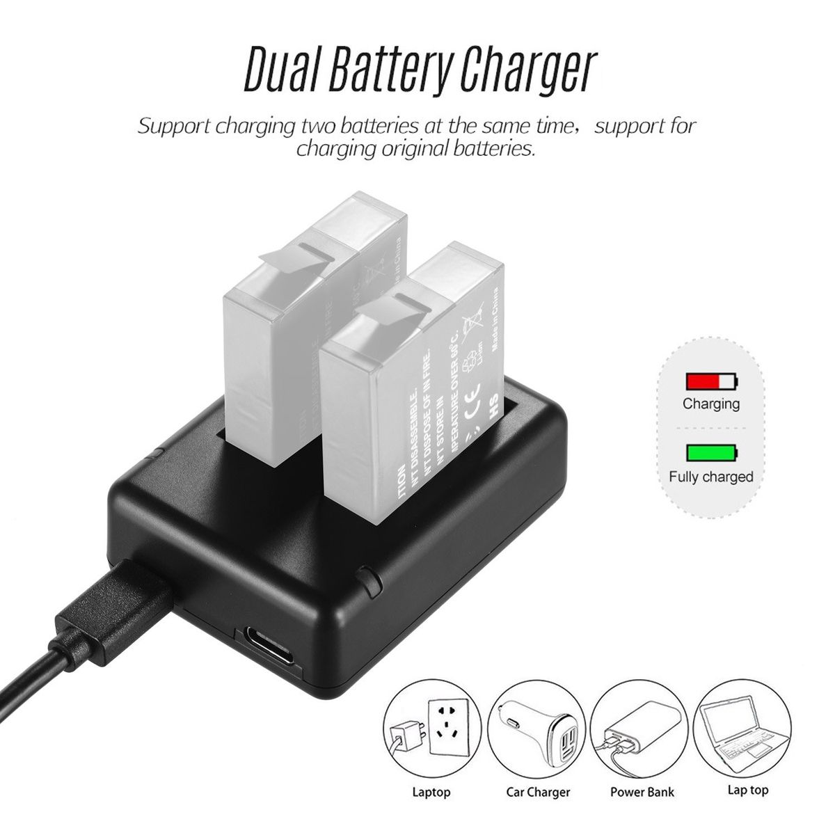The charger supports charging two batteries at the same time, supports for charging original batteries, with indicator light to show the charging state (Red: charging, Green: fully charged).