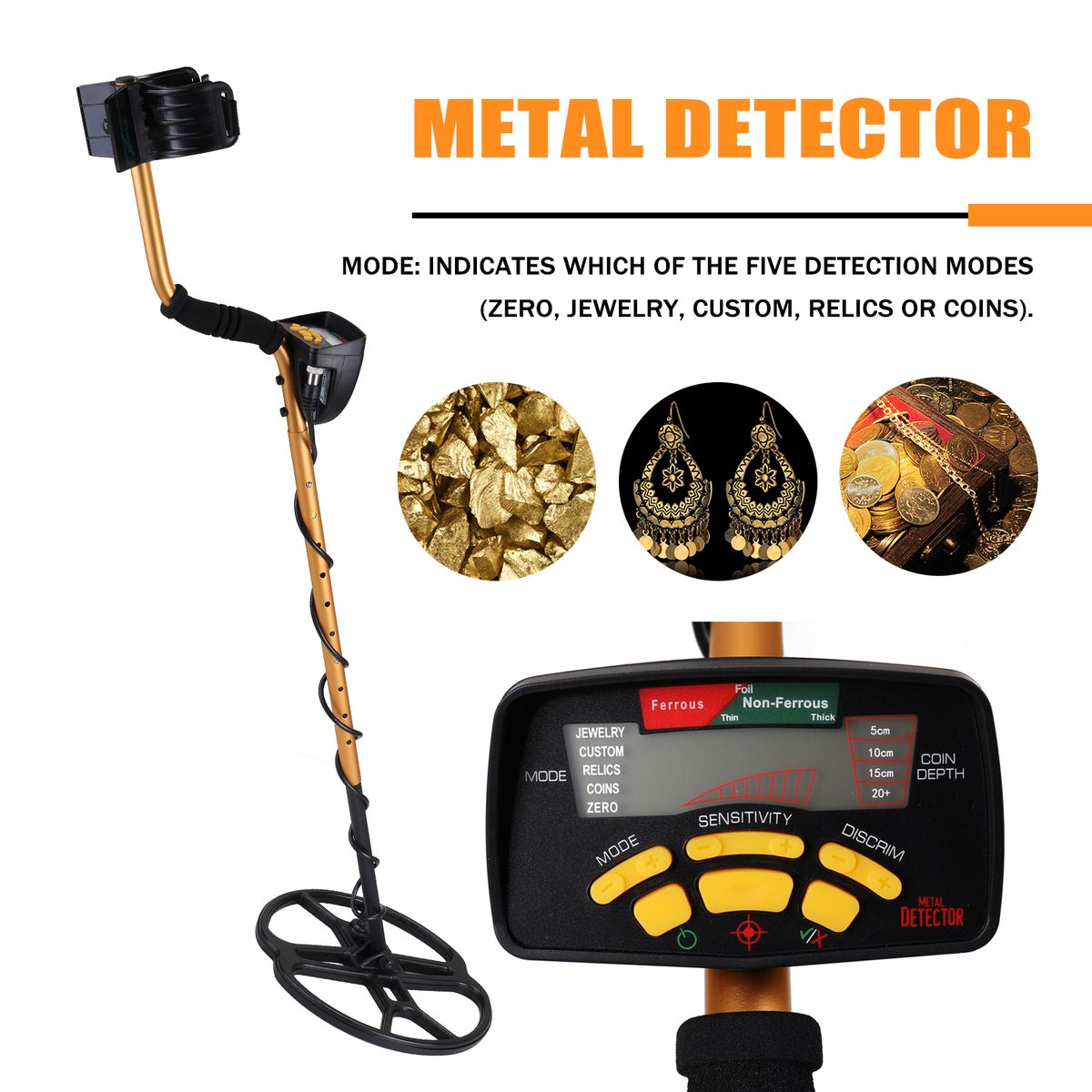 Mode: indicates which of the five detection modes (Zero, Jewelry, Custom, Relics or Coins).