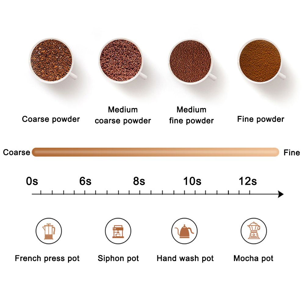 [Powerful Motor] With 150W powerful motor, this grinder can quickly grind coffee beans within 20 seconds. You can control the grinding time to adjust the coarseness of the powder.