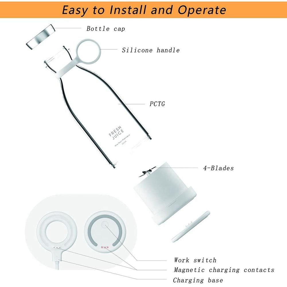 Easy to Clean and Operation: The juicer cup can be opened up and down. You can open the cap to drink and open the bottom to clean.This juicer is simple to operate, with only one button.Double click the switch to turn on the power.When working,you can shake the bottle by holding it at 45 degrees for better mixing.The single stirring time is 30 seconds.