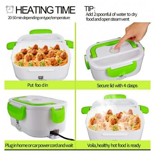 This portable food warmer comes with a handy spoon inside with a heat resistant carry handle making transportation to school or office easy. The heating lunch box features 2 heated compartments and a separate removable container allowing you to store and heat up a wide variety of food.