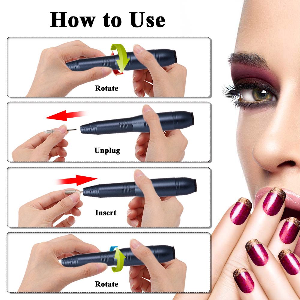 Easy to use: 6 types drill bits meet your needs for nail art. And it is easy to change bits without tools, just unplug it then insert. It\'s tiny pen shape makes it operation easily.