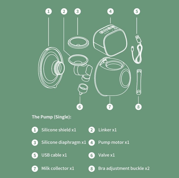 Packing list: silicone horn x 1, tee x 1, silicone diaphragm x 1, breast pump main unit x 1, USB charging cable x 1, bra x 1, duckbill valve x 1, bra adjustment buckle x 2Packing list: silicone horn x 1, tee x 1, silicone diaphragm x 1, breast pump main unit x 1, USB charging cable x 1, bra x 1, duckbill valve x 1, bra adjustment buckle x 2