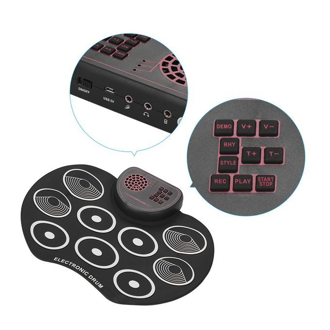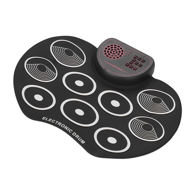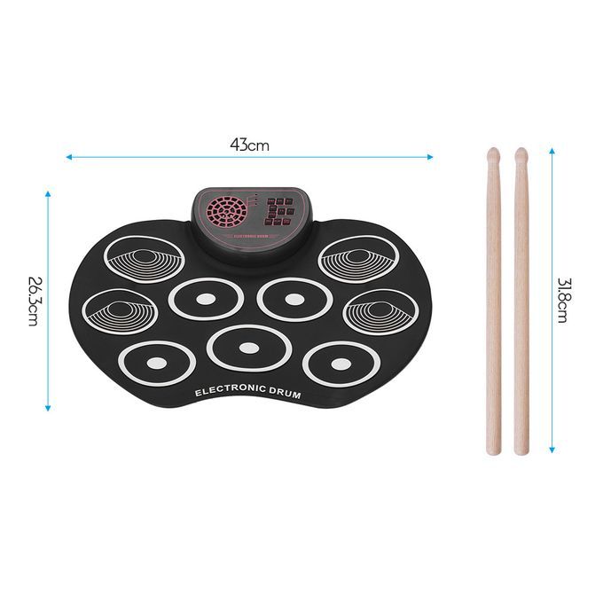 With 9 drum pads, including 3 x Tom drum, 1 x snare drum, 1 x bass drum, 3 x cymbal, 1 x Hi-hat.