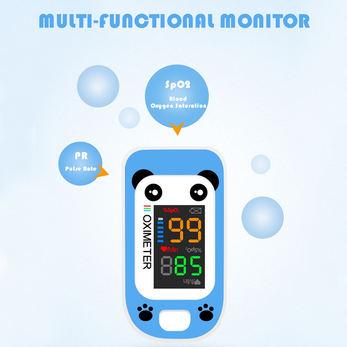 HEALTH-MONITOR: Blood-oxygen saturation(SpO2); Pulse rate(PR); Pulse rate Bar; Low-battery indicator.