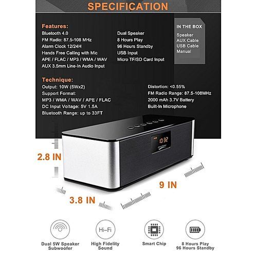 Take your music and radio anywhere. FM Radio, Alarm Clock, Hands-Free Calling, Micro TF/SD Card Support, USB Input, AUX 3.5mm Line-In. Get a few or sent as gifts to your family and friends!