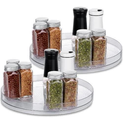 Pack Lazy Susan rotating trays to help you organize your home. 9.1 inches in diameter, use it in different rooms to store and organize different items to save space and keep things tidy360 degree rotation for easy access to items, you don't need to move many items to reach most corners. Raised lip prevents items from being knocked over when the tray rotatesEasy to use, no assembly required. The product is shipped as a whole, it can be used directly after opening the package, and a non-slip adhesive is provided to prevent slidingThe transparent acrylic material is easy to clean and does not affect the aesthetics of home decoration. It can be cleaned directly or rinsed with water. Be careful not to put it in the dishwasherSuitable for kitchens, cabinets, refrigerators, bedrooms, bathrooms, laundry rooms, living room tables, pantry, etc., can be used to store spices, vitamins, cosmetics, perfumes and other supplies