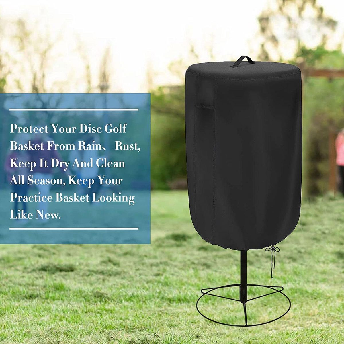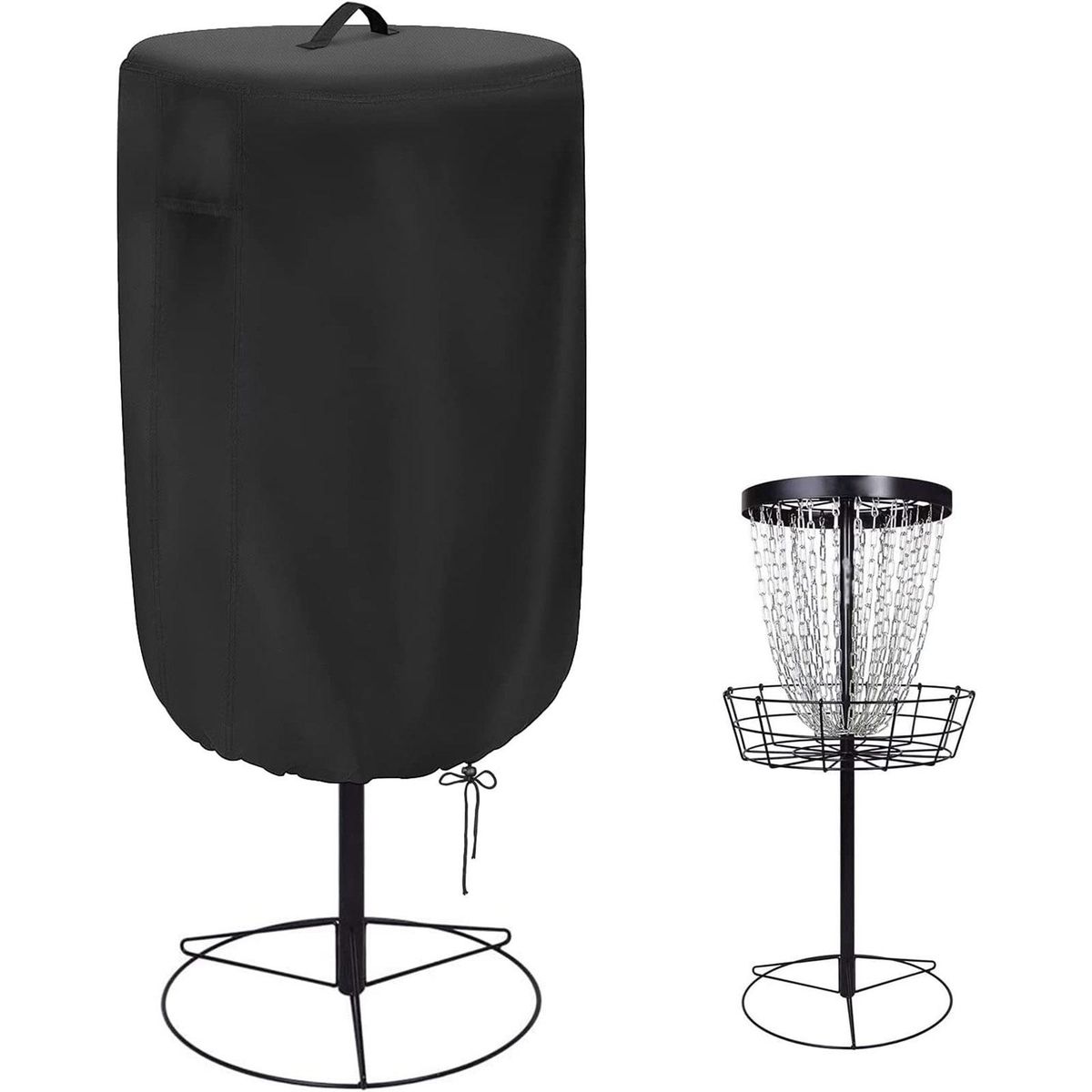 Perfect Size: Diameter 26inch, Height 35inch, fit for most Golf Disc baskets. Note: Please confirm the size of your Golf Disc basket before purchasing.Durable Material: Made of high quality polyester fabric, durable, waterproof coating can protect your Golf Disc practice basket all season.Design Features: Vents allow air to circulate. The handle on the top is convenient for your daily use. The adjustable drawstring rope can help tighten the cover. Make your Golf Disc basket better protected.Package Includes: 1x Golf Disc Basket Cover.Good Accessories: Great gift for recreational, casual players to professional players.