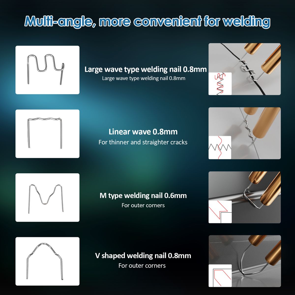Wide applications: Plastics welding, filler welding, hole repairs, and eliminating gaps. With various repairing nails, it is suitable for repairing horizontal, vertical, long, and short cracks. After repairing, it has strong seismic and distortion resistance.