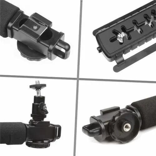 Features a shock-proof rubber handle that alleviates stress by offering a comfortable, secure grip.C-shaped design makes the device more practical and great for multi-angle filming.Soft foam grip adds comfort and eases the long shooting fatigue.Professional U-grip allows you to hold your camera or Smartphone down low when filming skiing, snowboarding, skateboarding, etc.With a sponge handle and non-slip feet, it is more stable.It can be used with most SLR cameras or camcorders.