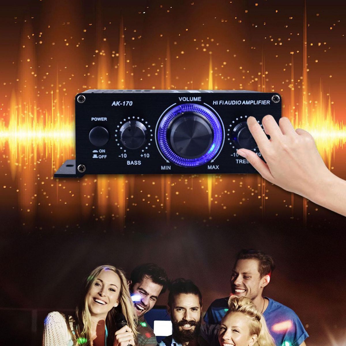 Home mini HiFi power amplifier, aluminum alloy enclosed amp, sturdy and lightweight, perfect for home audio system.20W+20W dual channel output, 4-16 ohms stereo speakers, 20-20KHZ frequency response, support DC12V power supply.Simple and compact design but practical and powerful. HiFi stereo surround sound quality, clear and clarity sound, no audible noise, dead silent when nothing is playing through it.Volume control: LED volume control knob design, independent Bass and Treble volume control knob, easy to operate.A perfect gift for the people who who pursue HiFi sound.
