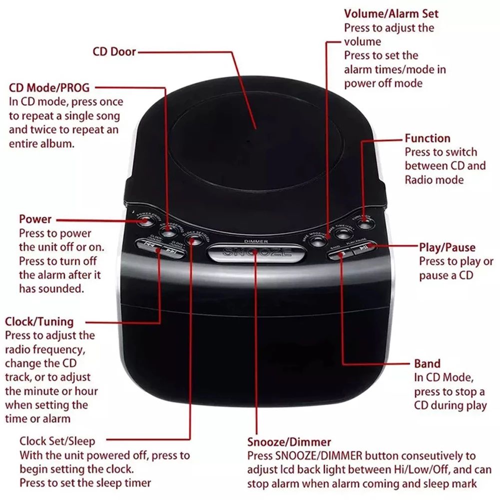 1. CD playback function: support CD CD-R single and entire disc repeat play mode can be selected, does not support CD-ROM MP3 DVD format. 2. Radio function: FM: 87.5-108MHZ AM: 520-1710KHZ 3. Double speakers, ultra-thin body, bedside desk, desk with large screen LED digital clock display, blue backlight, stylish atmosphere 4. Clock control function: you can set timed boot, CD radio ringtones can be set as the alarm ringtone, ar the alarm rings, pre the snooze on, you can remind once every 9 minutes. For example, I want the machine to automatically open the CD and play automatically at 7 o'clock tomorrow morning, which is achievable. 5. Sleep shutdown function: When listening to the radio or listening to a CD, set the shutdown time, and it will automatically shut down at the hour. 6. The display screen is blue light, large font, 12-hour clock. 7. Body size: length 14.3X width 21.5X height 9.1CM, display size: length 9.5X width 3.5CM 8. Machine weight: 1.3KG 9. Power supply (plug in directly to use) battery 9V (battery is only set to remember 100 million function, can not be used for playback), 10. USB socket: output (DC5V 1A) for mobile phone charging
