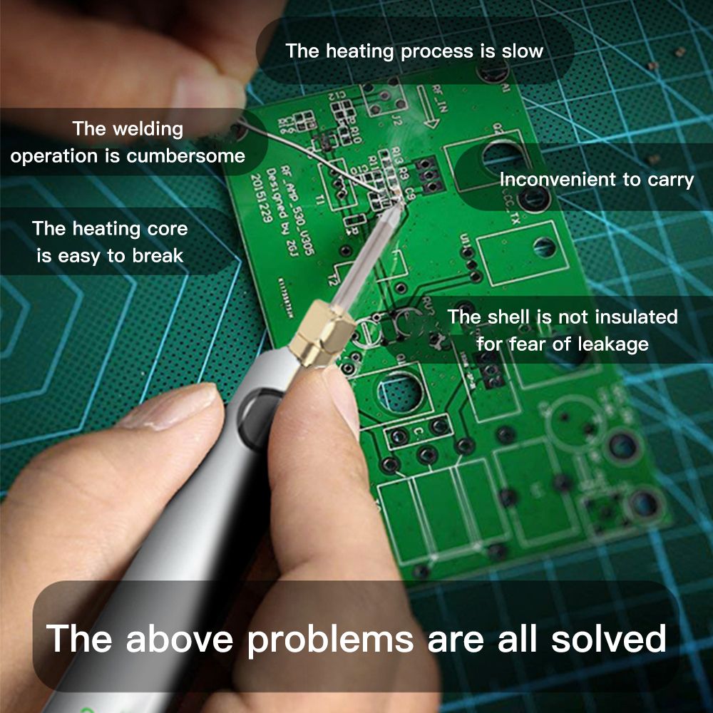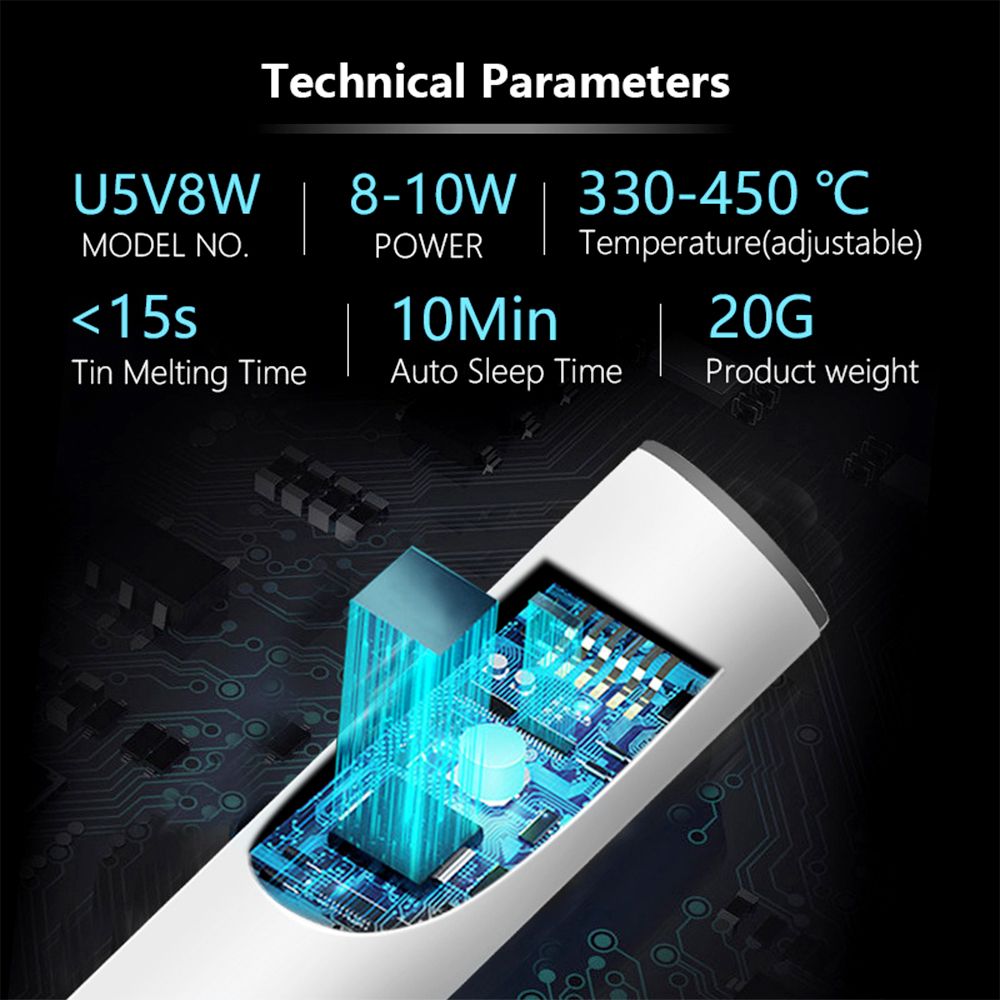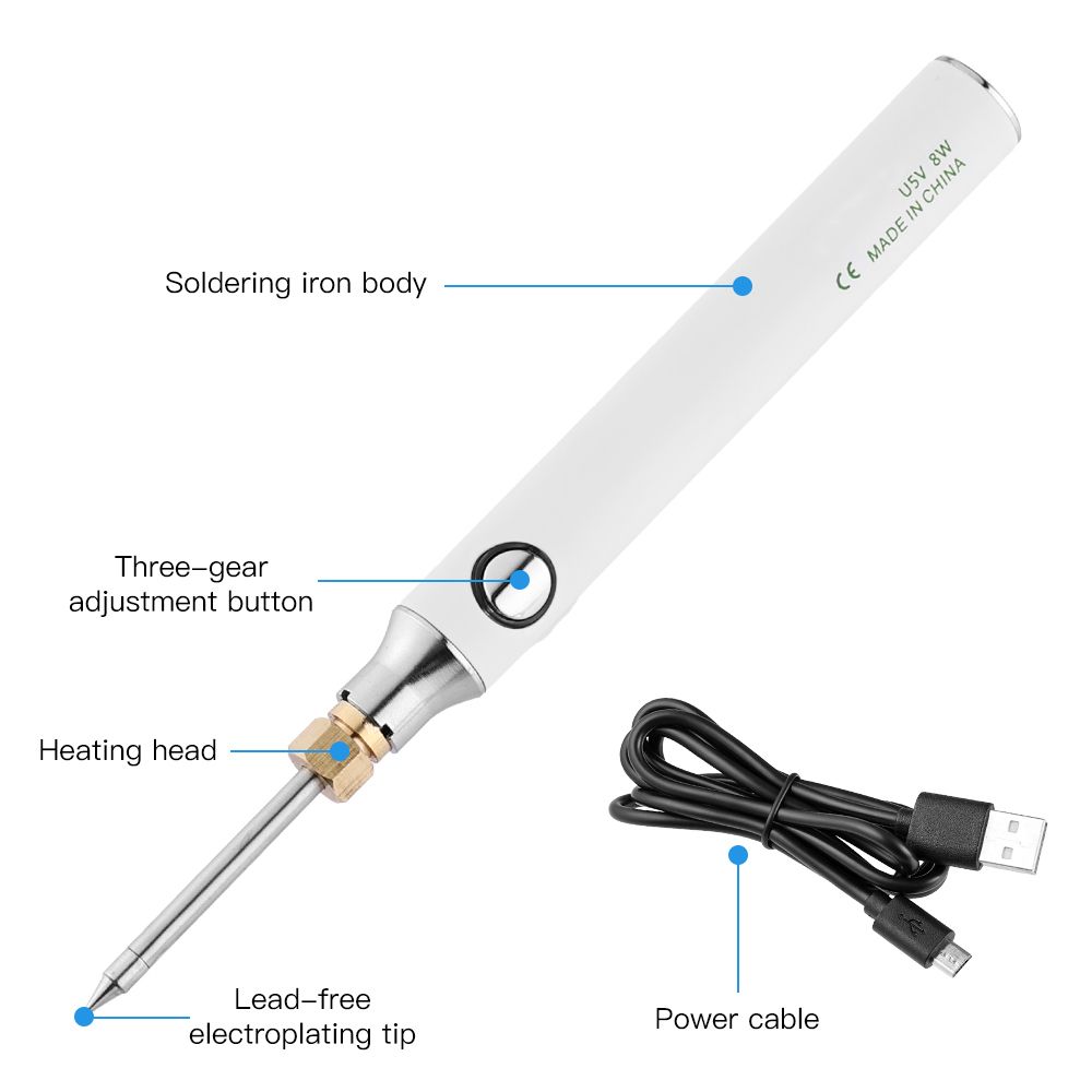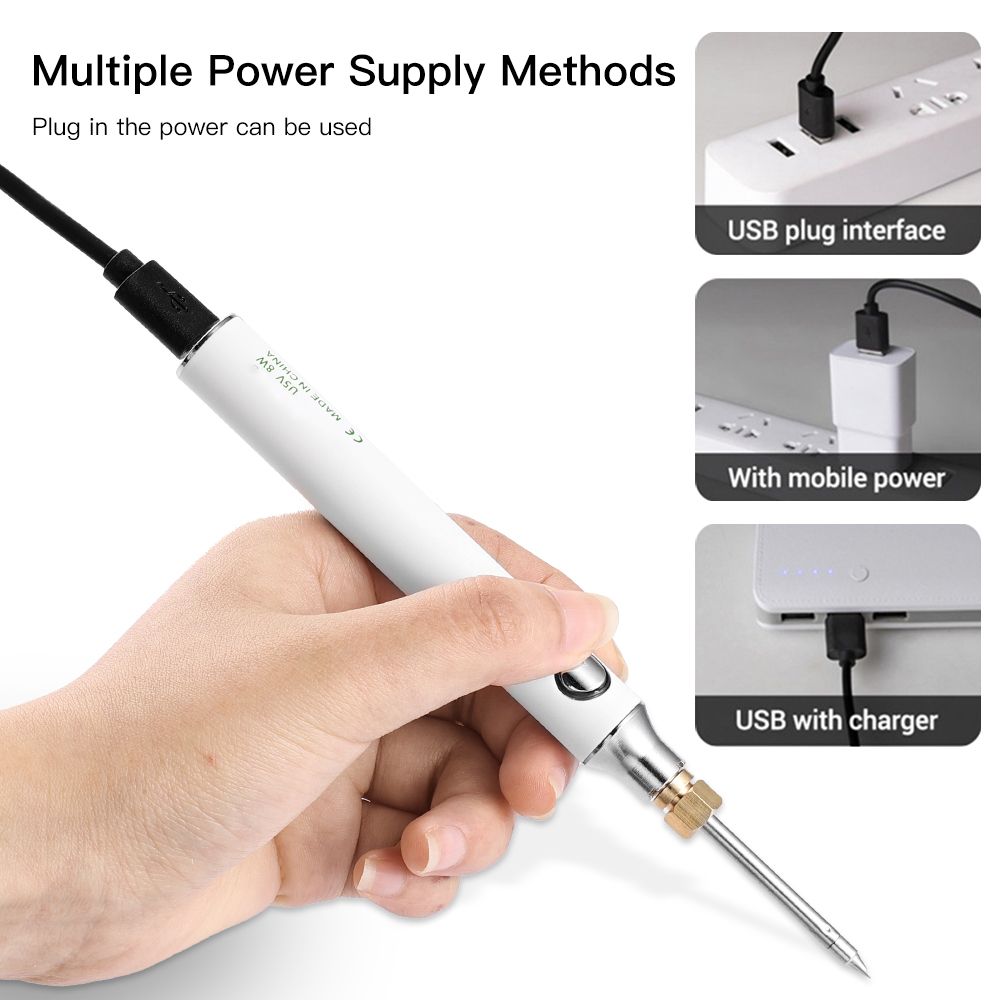 Quick energized:It can be used by plugging in the power supply, which is simple and convenient.Note: plug in the power to use a soldering iron no battery.Multiple power supply methods:1:plug in the power can be used.USB with the charger:it can be used after plugging in the power supply, and the can be used for 8 hours.Flexible tensile and high temperature resistanceInternal heating thermostat:Aluminum-free soldering tin, anti-ox-idation, fast heating on tin, easy installation.
