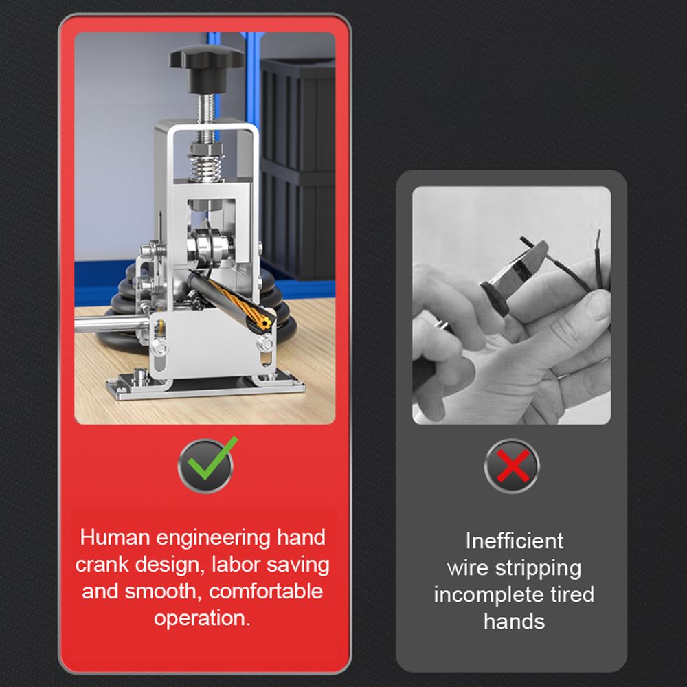 【Easy to Use】: After placing the wire, adjust the knob to clamp the to the wire and pull the wire to move it past the wire feed wheel. After passing through the stripping machine, the outer skin of the wire is stripped and the core can be removed. Multi-hole feeder plate, convenient for different thickness of cables.