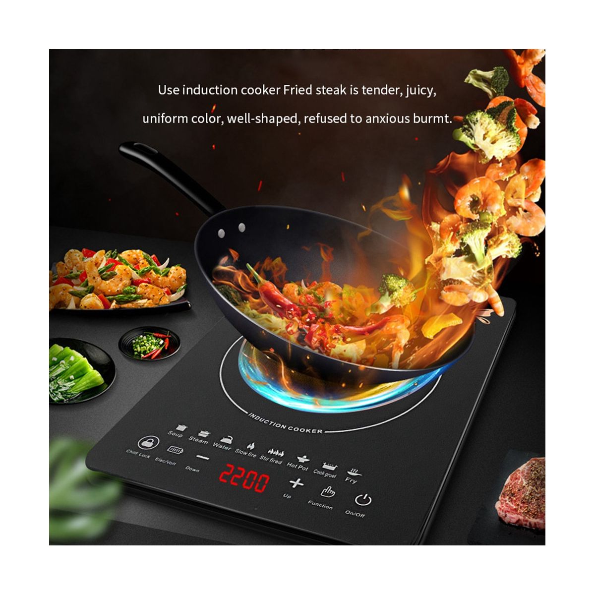 Detailed Information About The Product:Versatility: Used for steaming food, stir-frying, cooking food, stewing soup, cooking hot pots, etc. with various functions. In the process of use, it can be set according to the needs of food. This induction cooker can be adjusted to 8 levels of fire power, and you can also adjust the temperature at any time, and you can quickly choose the power you need from 120W to 2200W. This portable induction cooker is perfectly suited for your various cooking needs.