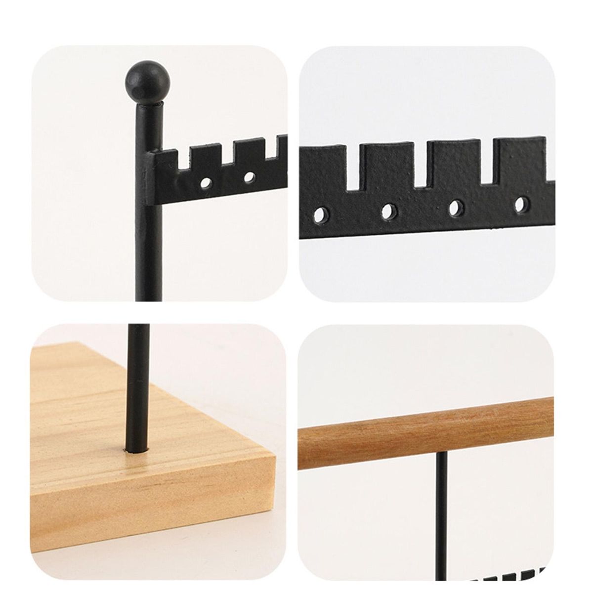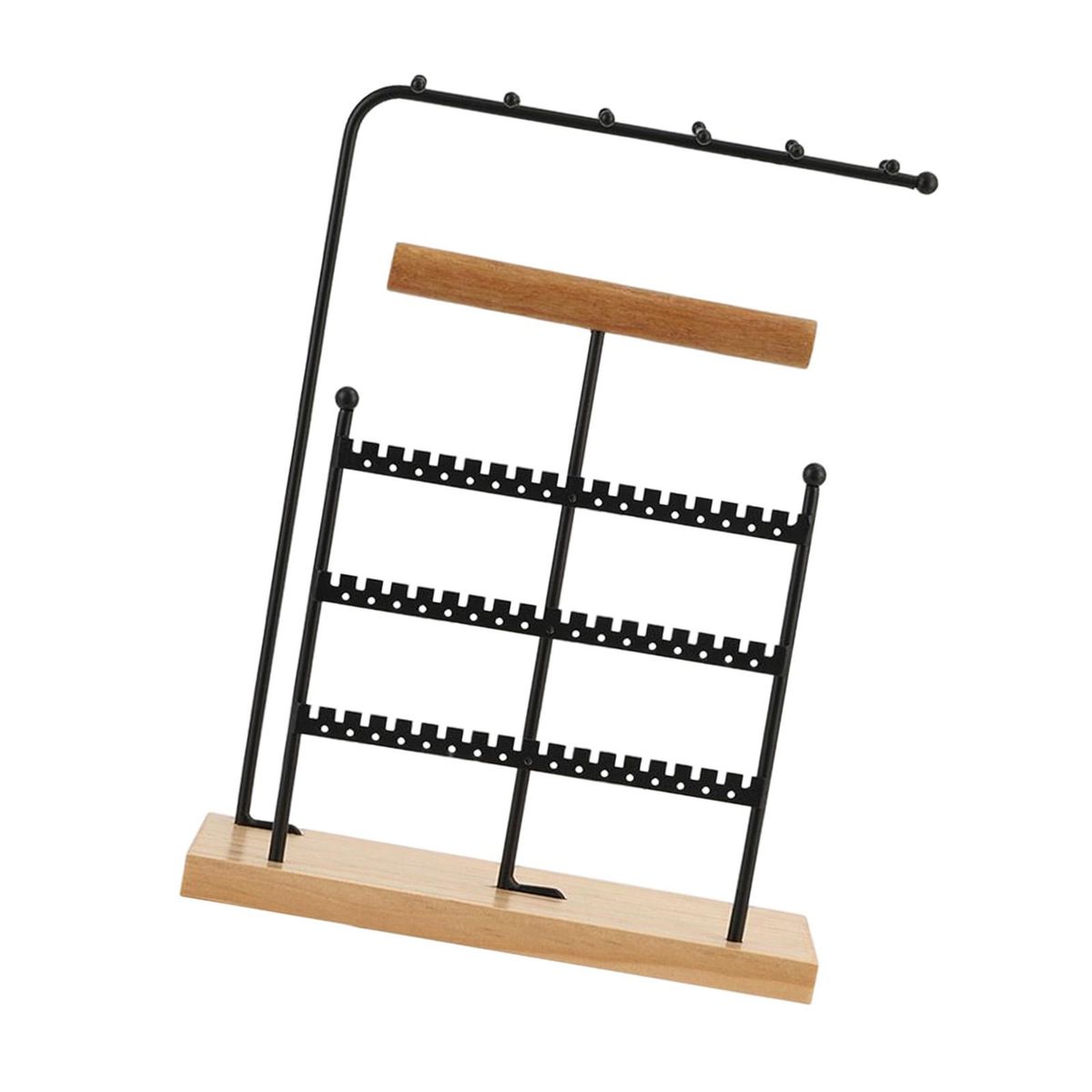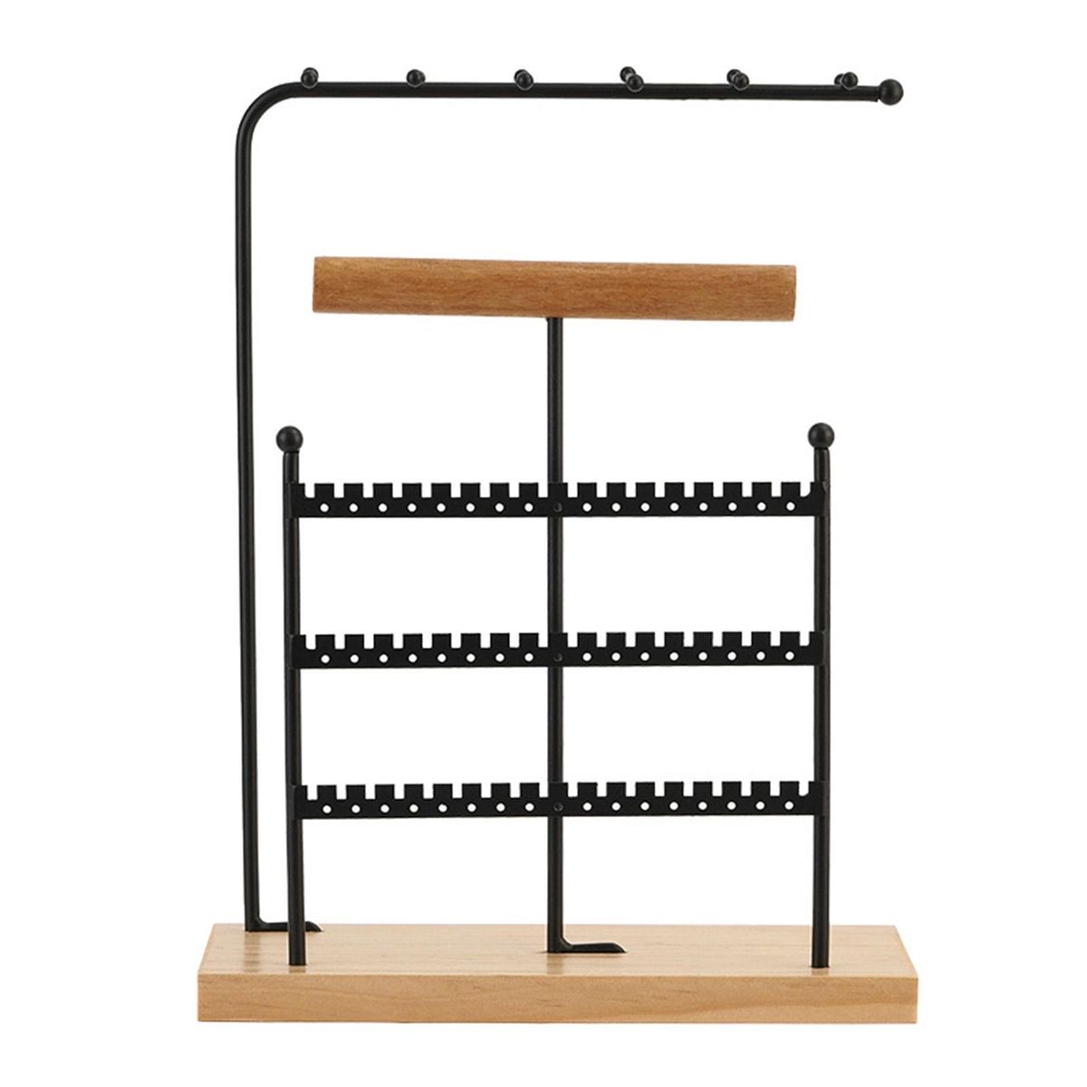 Feature: A black bar jewelry and necklace display stand with 3 consecutive layers of iron frame and 1 layer of wooden frame, and a separate layer of hanging iron frame, provide enough space to classified and placed jewelry.
