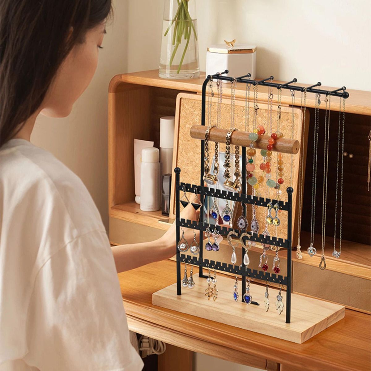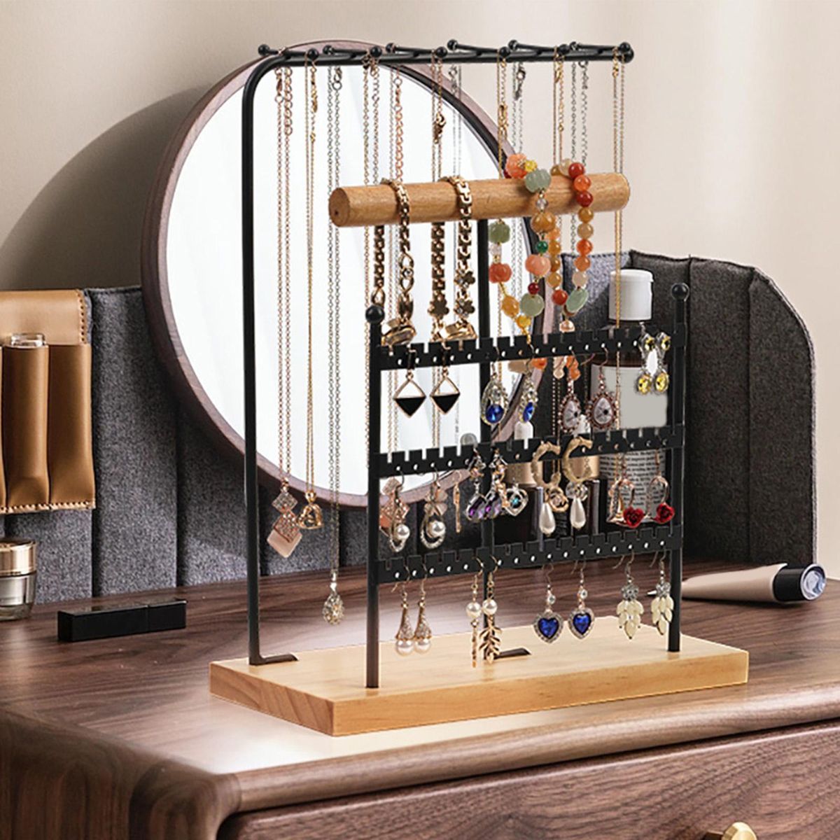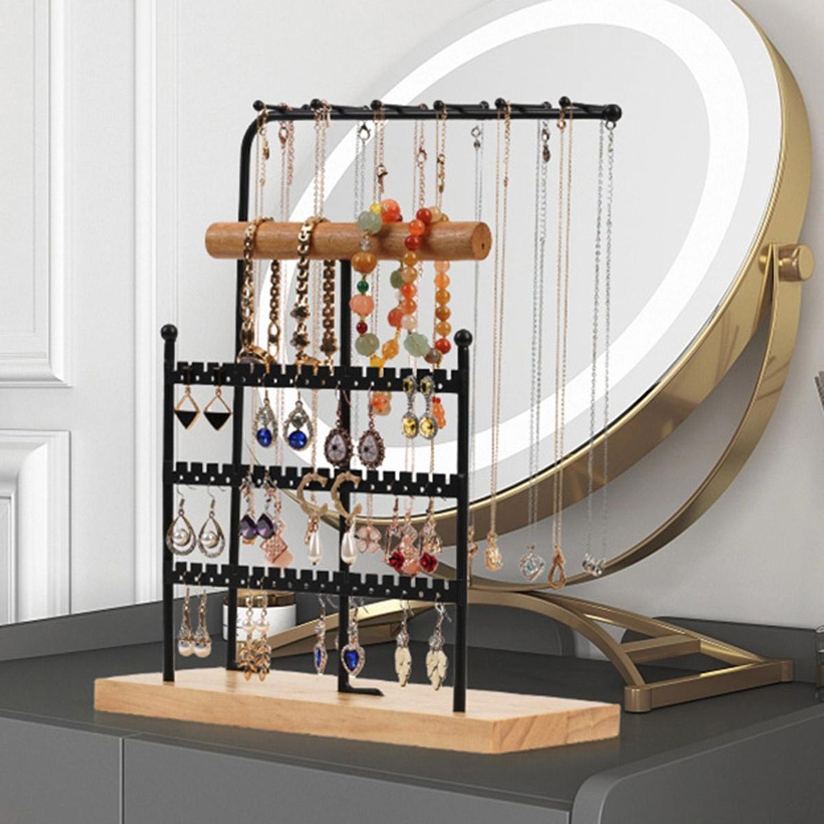 Feature: A black bar jewelry and necklace display stand with 3 consecutive layers of iron frame and 1 layer of wooden frame, and a separate layer of hanging iron frame, provide enough space to classified and placed jewelry.