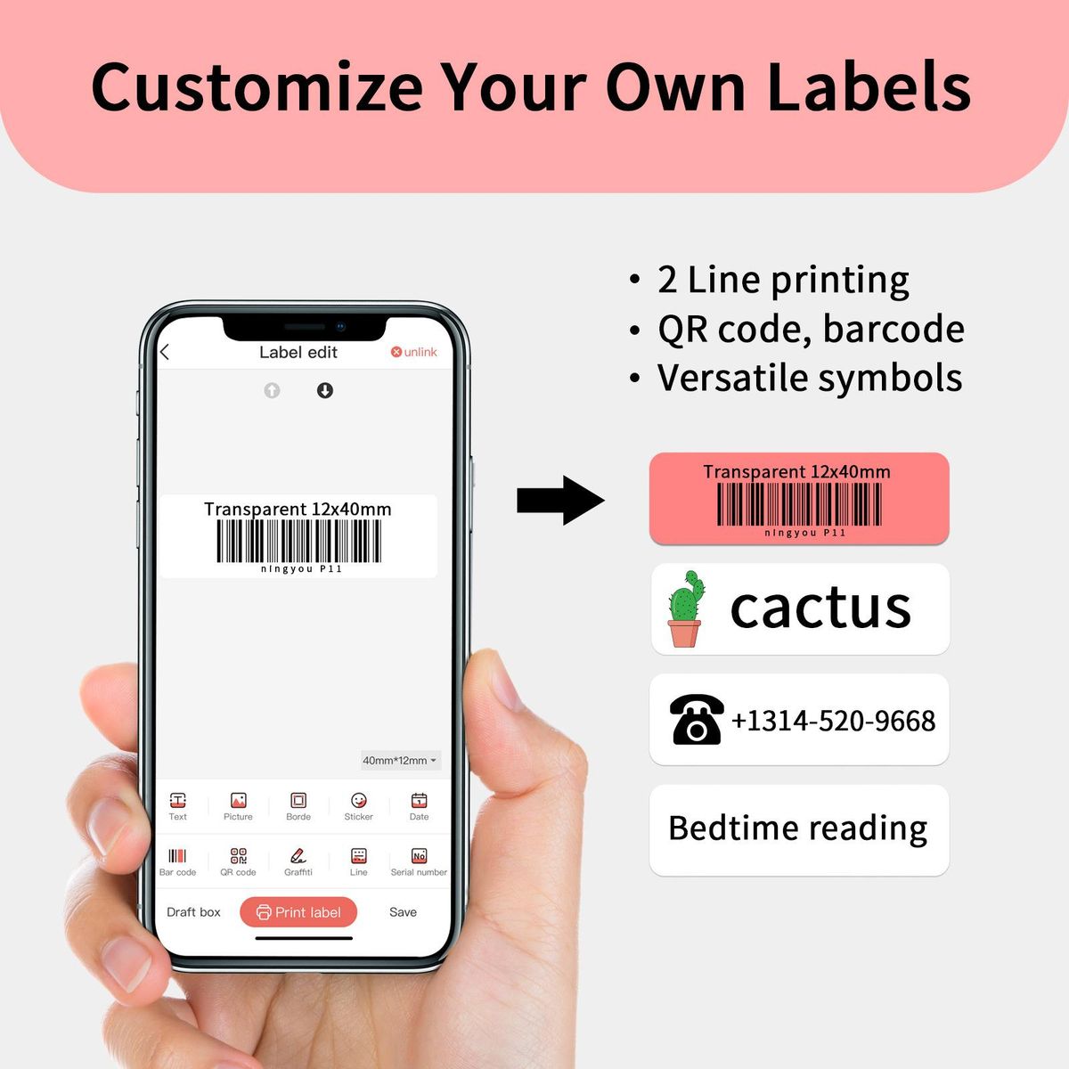 Support all major label formats: price, date, size, weight, name, etc.