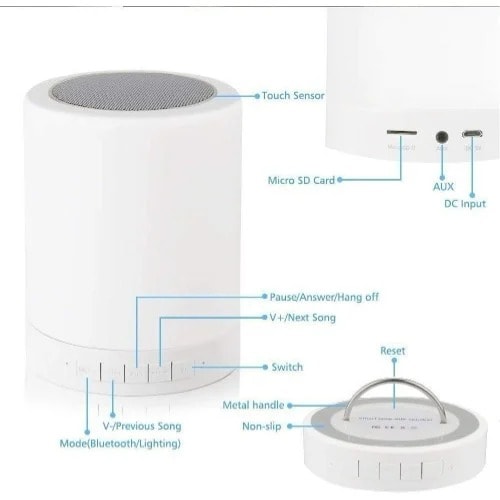 Material: ABS+Metal. Microphone: Support. Bluetooth: Bluetooth 2.1. Ports: Micro USB. Lamp power: 1.6W. Lumen:160LM. Battery:3.7V 800mAh. Audio Input: 3.5mm jack cable. Working Frequency: 2.402GHz~2.48GHz. Frequency Response:50HZ~20KHz. Transmission Range: UP to 10 meters. Audio input:3.5mm jack cable.