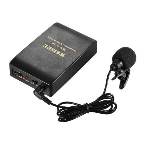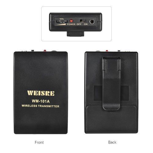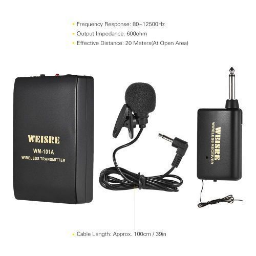Features:Portable wireless lavalier microphone to effectively amplify louder sound.80-12,500Hz frequency response, high sensitivity and clear sound quality without hum or crackle noise.The design of clip-on lapel microphone and belt pack transmitter allows you to be more comfortable and enjoyable while speaking.Operating range approx. 20 meters open area.Microphone cable length up to 100cm, transmitter with volume control and LED indicator, wireless receiver with 6.35mm plug.Power Source: 1 * 9V battery for the transmitter and 1 * AA battery for the receiver.Easy to use, ideal for giving speech, lecture, lecture, promotion, tours, etc.