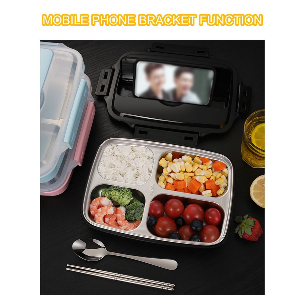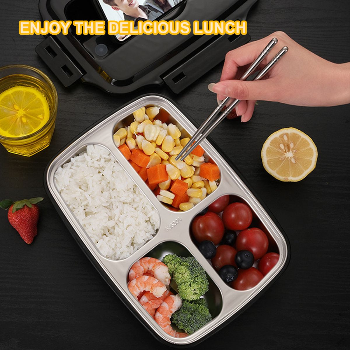 Comes with a pair of chopsticks and a spoon on top, convenient to use.