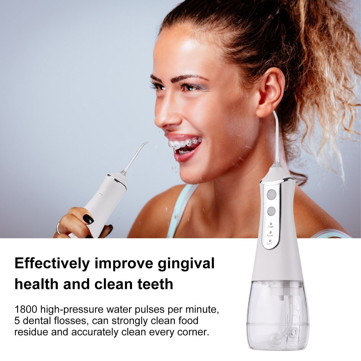 Effectively improve gingival health and clean teeth: 1800 high-pressure water pulses per minute, 5 dental flosses, can strongly clean food residue and accurately clean every corner.